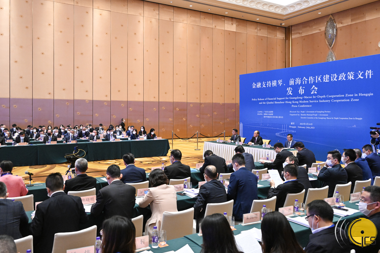 A fim de cumprir as estratégias do Governo Central e implementar as exigências do «Projecto Geral de Construção da Zona de Cooperação Aprofundada entre Guangdong e Macau em Hengqin» e do «Projecto de Reforma e Abertura da Zona de Cooperação Aprofundada na Indústria de Serviços Modernos entre Qianhai Shenzhen e Hong Kong», o Governo da Província de Guangdong em conjunto com o Banco Popular da China e a Zona de Cooperação Aprofundada em Qianhai realizou, hoje (24 de Fevereiro), na Zona de Cooperação Aprofundada em Hengqin, por videoconferência, uma conferência de imprensa sobre as políticas do “Parecer de apoio financeiro prestado para a construção da Zona de Cooperação Aprofundada entre Guangdong e Macau em Hengqin” e do “Parecer de apoio financeiro prestado para a construção da Zona de Cooperação Aprofundada na Indústria de Serviços Modernos entre Qianhai Shenzhen e Hong Kong”. O chefe da Comissão de Gestão da Zona de Cooperação Aprofundada entre Guangdong e Macau em Hengqin e Chefe do Executivo da Região Administrativa Especial de Macau (RAEM), Ho Iat Seng, o vice-governador do Banco Popular da China e director da Administração Estatal de Divisas Estrangeiras, Pan Gongsheng, o vice-governador da Província de Guangdong e sub-chefe da Comissão de Gestão da Zona de Cooperação Aprofundada em Hengqin, Zhang Xin, e o membro permanente do comité municipal do PCC de Shenzhen e director da Administração de Qianhai, Zeng Pai, discursaram no evento.