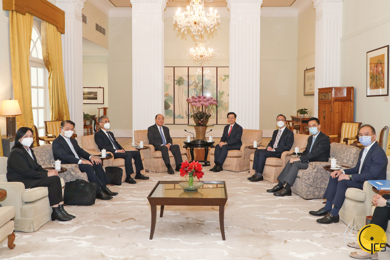 O Chefe do Executivo da RAEHK, John Lee Ka-chiu, deu as boas-vindas à delegação e disse que Hong Kong e Macau têm complementado as vantagens de cada um, e que existe uma cooperação estreita nas diferentes áreas, incluindo comércio, infraestrutura transfronteiriça, cultura, turismo, entre outras, na promoção conjunta da construção da Grande Baía. Por exemplo, na área do comércio, depois da assinatura do Acordo de Estreitamento das Relações Económicas e Comerciais entre a Região Administrativa Especial de Hong Kong e a Região Administrativa Especial de Macau (Hong Kong-Macau CEPA), em 2017, empresários de Hong Kong entraram no mercado de Macau obtendo mais e melhores oportunidades de negócio, bem como impulsionaram o comércio e fluxo de investimento entre as duas cidades.