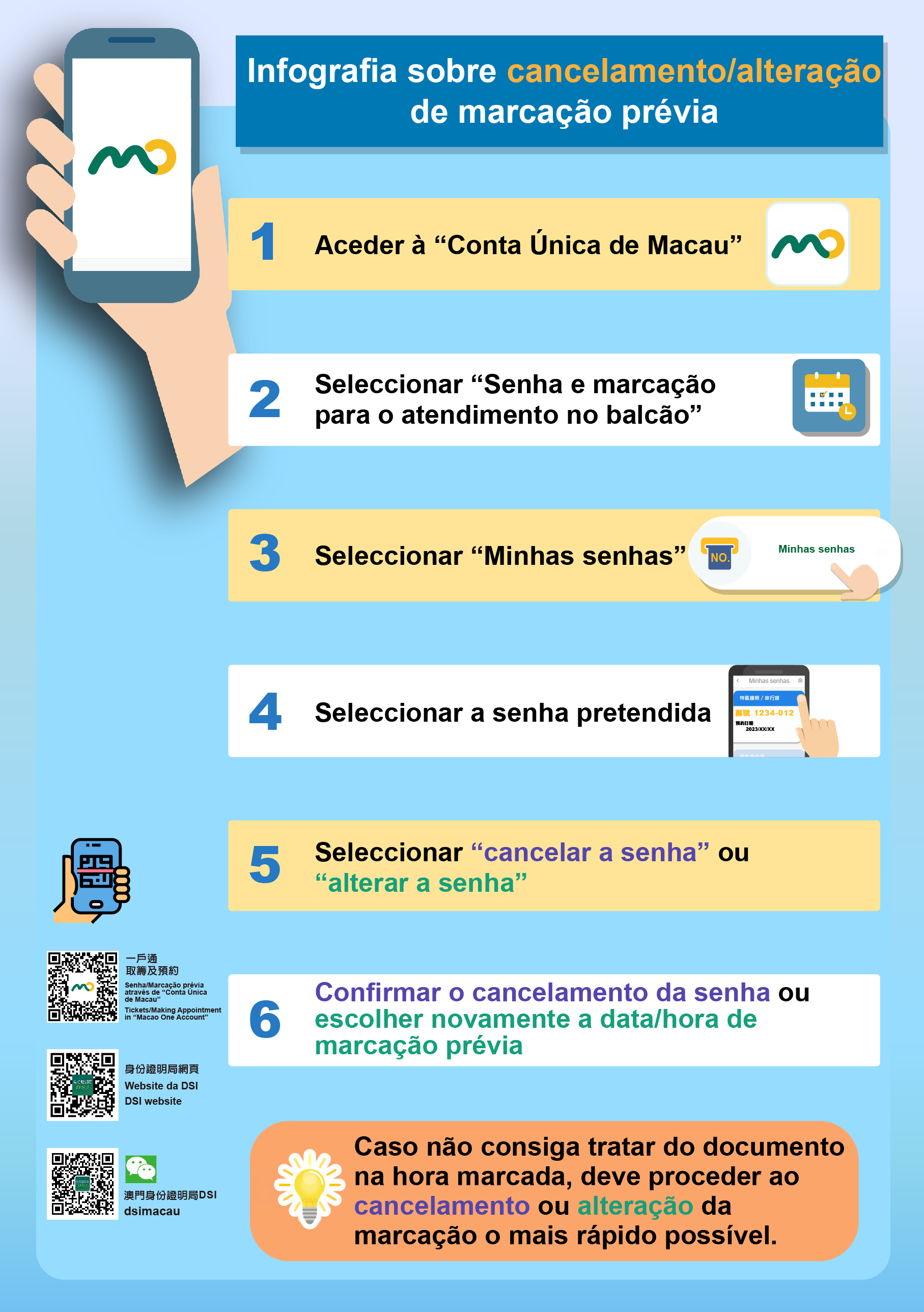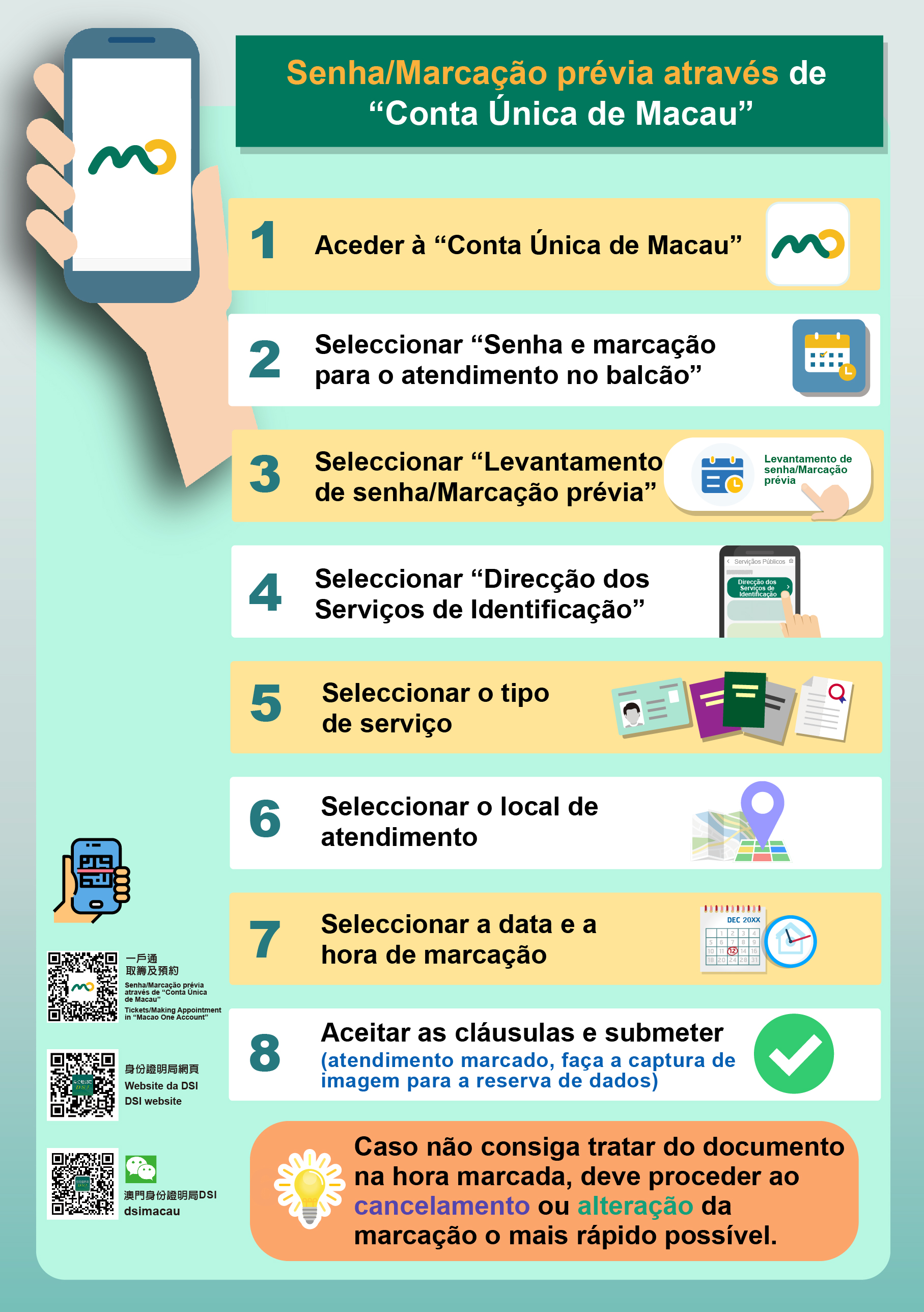 Os cidadãos podem efectuar a marcação prévia através da funcionalidade “Senha e marcação para o atendimento no balcão” da “Conta Única de Macau” ou da página electrónica da DSI ( www.dsi.gov.mo ) e, devem chegar pontualmente ao local para o tratamento do documento. Não estando disponível a obtenção de senha in loco durante as horas adicionais de serviço, contudo, para levantar o documento nas horas acima referidas, não é necessária a marcação prévia. Caso não consigam tratar do documento na hora marcada, devem proceder ao cancelamento ou alteração da marcação através da “Conta Única de Macau” ou da página electrónica da DSI, a fim de libertar a vaga para outra pessoa.