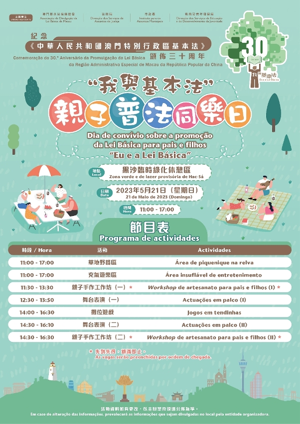 Por ocasião do 30.º aniversário da promulgação da “Lei Básica da Região Administrativa Especial de Macau da República Popular da China”, a Direcção dos Serviços de Assuntos de Justiça, o Instituto para os Assuntos Municipais, a Direcção dos Serviços de Educação e de Desenvolvimento da Juventude e a Associação de Divulgação da Lei Básica de Macau vão coorganizar, no próximo Domingo (dia 21), o Dia de convívio sobre a promoção da Lei Básica para pais e filhos “Eu e a Lei Básica”, divulgando, de uma forma relaxada, a “Constituição” e a “Lei Básica de Macau” através dos jogos e divertimento.
