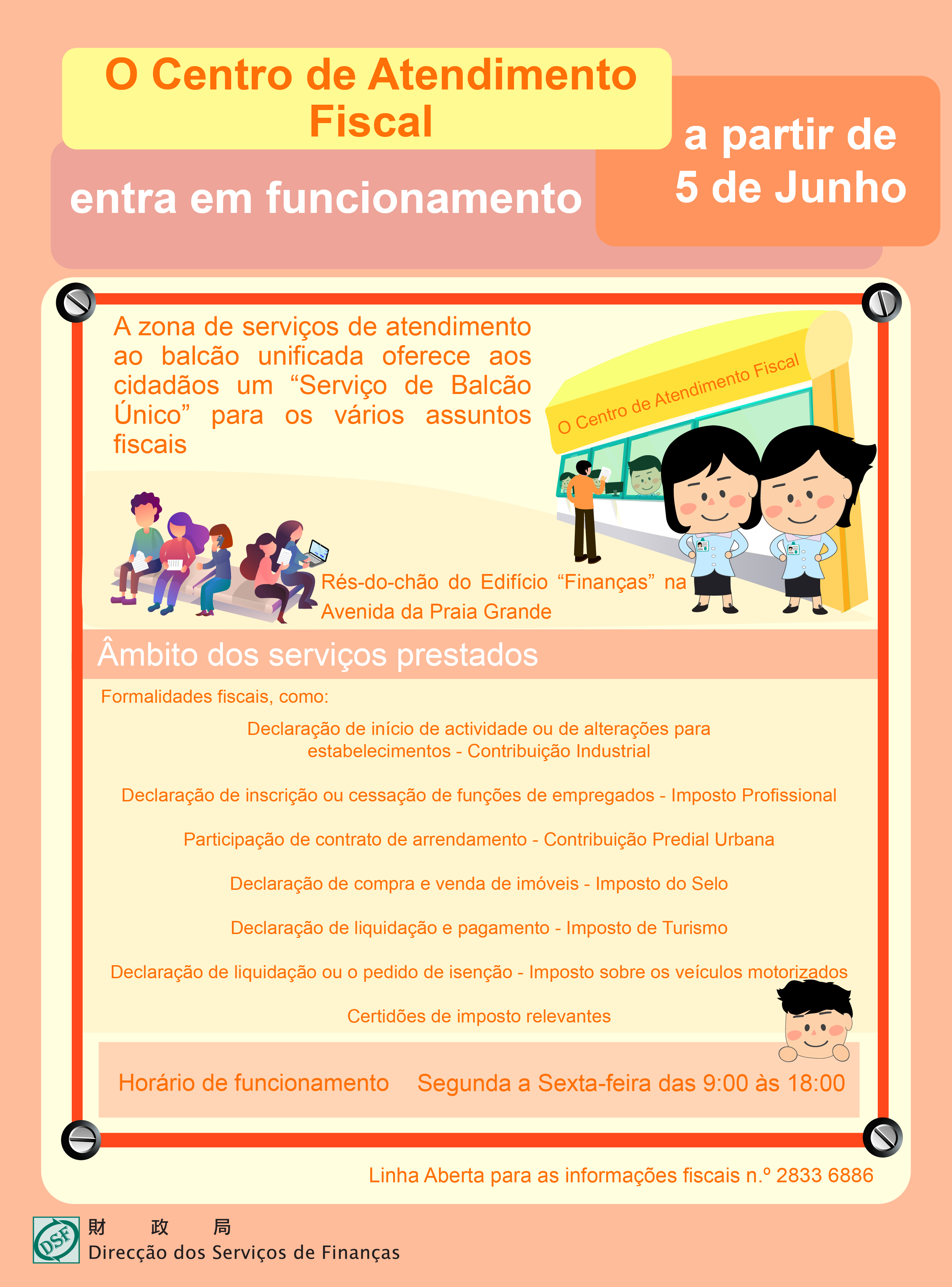 A fim de facilitar os cidadãos no tratamento de diversos assuntos fiscais, a Direcção dos Serviços de Finanças tem vindo a persistir na optimização dos trabalhos de atendimento fiscal, assim, a partir de 5 de Junho de 2023, os balcões de atendimento localizados no rés-do-chão (1.º Centro de Serviços) e na sobreloja (2.º Centro de Serviços) do Edifício “Finanças” sito na Avenida da Praia Grande, são integrados no “Centro de Atendimento Fiscal”, para prestar um “Serviço de Balcão Único” aos cidadãos abrangendo os vários assuntos fiscais.