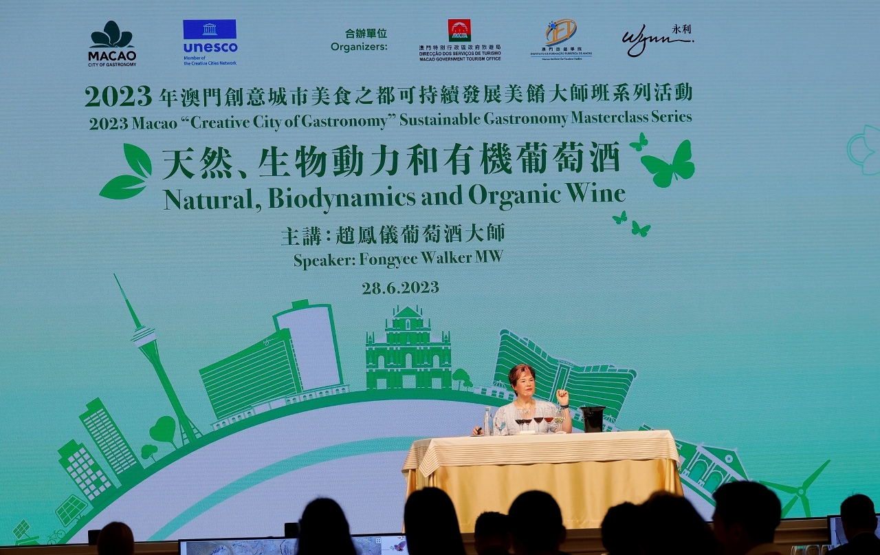 A primeira sessão da actividade, “Masterclasses de Gastronomia Sustentável - Masterclass de Vinho Natural, Biodinâmico e Orgânico”, teve lugar hoje (dia 28), no Grand Theater do Wynn Palace, contando com a presença do subdirector da DST, Cheng Wai Tong, da presidente e directora executiva da Wynn Resorts (Macau), Linda Chan, da presidente substituta do IFTM, Diamantina Rosário Coimbra, do presidente da União das Associações dos Proprietários de Estabelecimentos de Restauração e Bebidas de Macau, Chan Chak Mo, do presidente da Associação de Pequenas e Médias Empresas de Restauração de Macau, Ip Weng Fat, do director geral da Associação de Cozinha de Macau, Sunny Ip, do presidente da Associação Comercial de Pastelaria e Lojas de Lembranças de Macau, Lam Wai Hong, o vice-presidente da Associação de Hotéis de Macau, Adrian Pinto Marques, do presidente da Direcção da Associação dos Empregados do Sector de Restauração de Macau, Sou Wai Leong, do presidente da Direcção da Associação de Empregados de Restaurantes e Padarias de Macau, Che Chi Wai, mestre de vinhos, Fongyee Walker MW, a chef de alimentação vegetariana, Andreea Apostol, o gerente geral do Restaurante-Escola do IFTM, Hans Lee Rasmussen, entre outros.