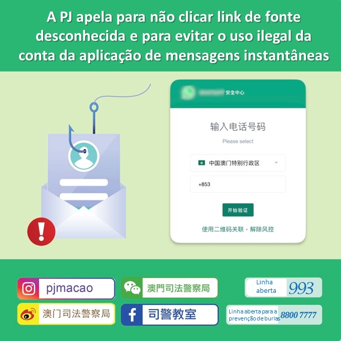 Nos últimos anos, os criminosos têm usado a referida forma para roubar a conta de mensagens instantâneas dos cidadãos e, em seguida, tentam burlar “os amigos” constantes nas listas de contactos. Dado terem causado prejuízo em alguns casos, a PJ apela ao público para não clicar em links de fonte desconhecida nas mensagens SMS. Devem sempre confirmar as mesmas mensagens através de meio oficial, verificar se o URL do site é exactamente igual ao do site oficial e, havendo suspeitas, não fornecerem os dados das suas contas ou código de verificação. Apela ainda a quem estiver perante uma situação de burla ou perante qualquer tipo de crime, para fazer a denúncia à PJ através da linha aberta para a prevenção de burlas, nº 8800 7777 ou da linha aberta 993.