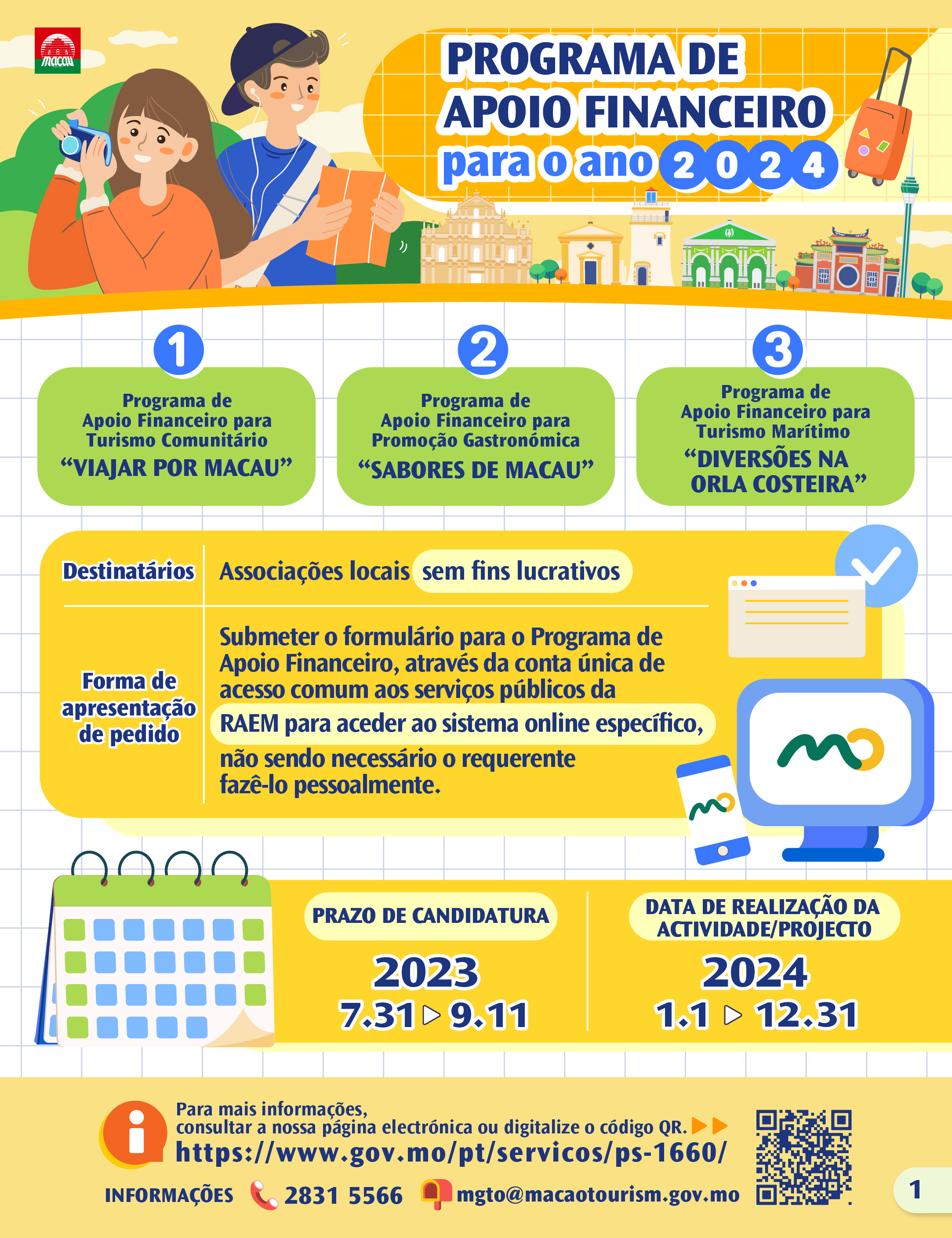 As candidaturas aos programas de apoio financeiro para o Turismo Comunitário “Viajar por Macau”, Promoção Gastronómica “Sabores de Macau” e Turismo Marítimo “Diversões na orla costeira” da Direcção dos Serviços de Turismo (DST) para o ano de 2024 estarão abertas a partir de amanhã (31 de Julho) até 11 de Setembro deste ano.
