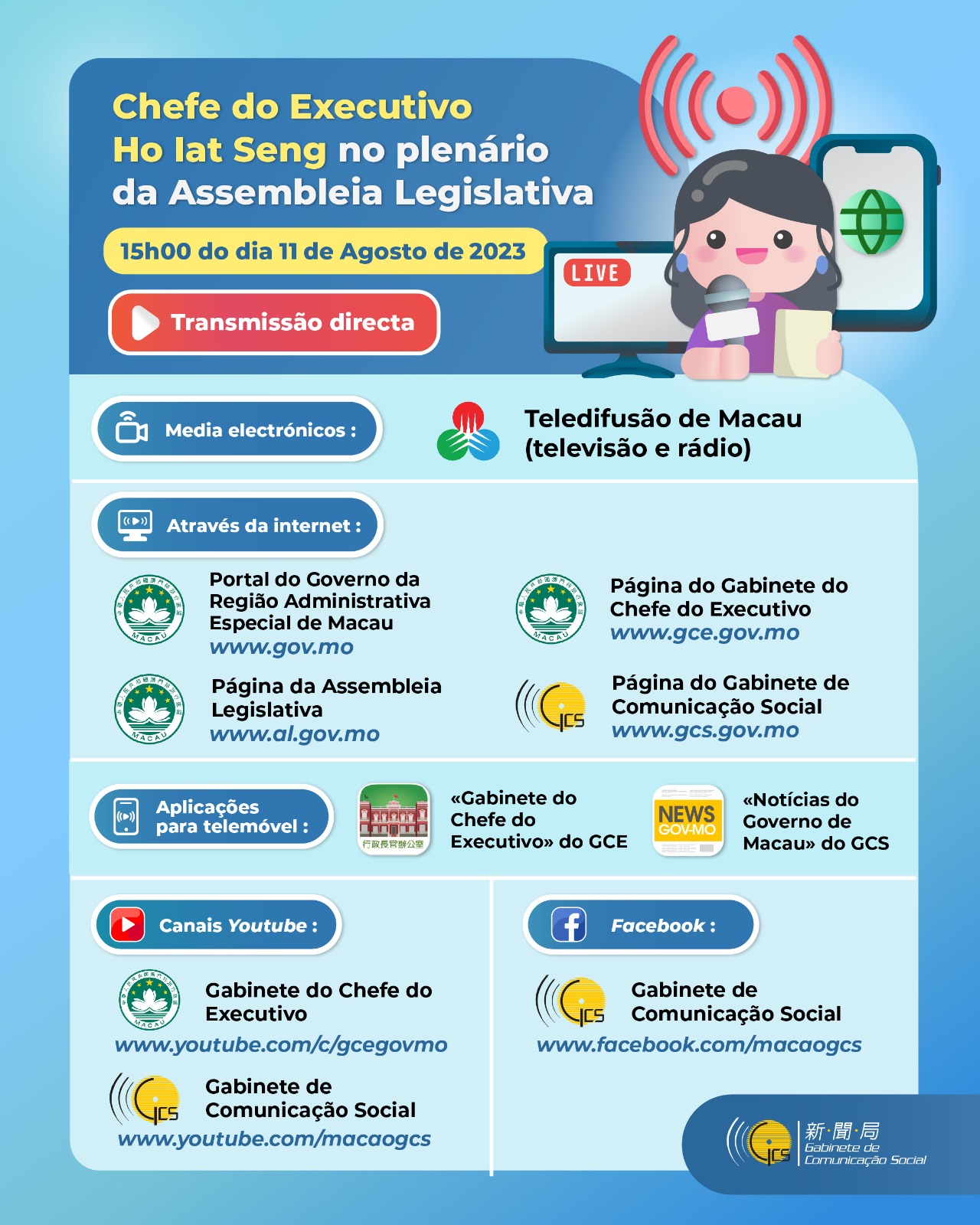 O Chefe do Executivo, Ho Iat Seng, estará presente, no dia 11 de Agosto pelas 15h00, na reunião plenária da Assembleia Legislativa, onde responderá às perguntas dos deputados sobre a acção governativa e assuntos relacionados com a vida da população, com o objectivo de reforçar a comunicação com os membros do órgão legislativo e para que haja uma melhor compreensão, por parte da população, sobre o trabalho desenvolvido pelo governo.
