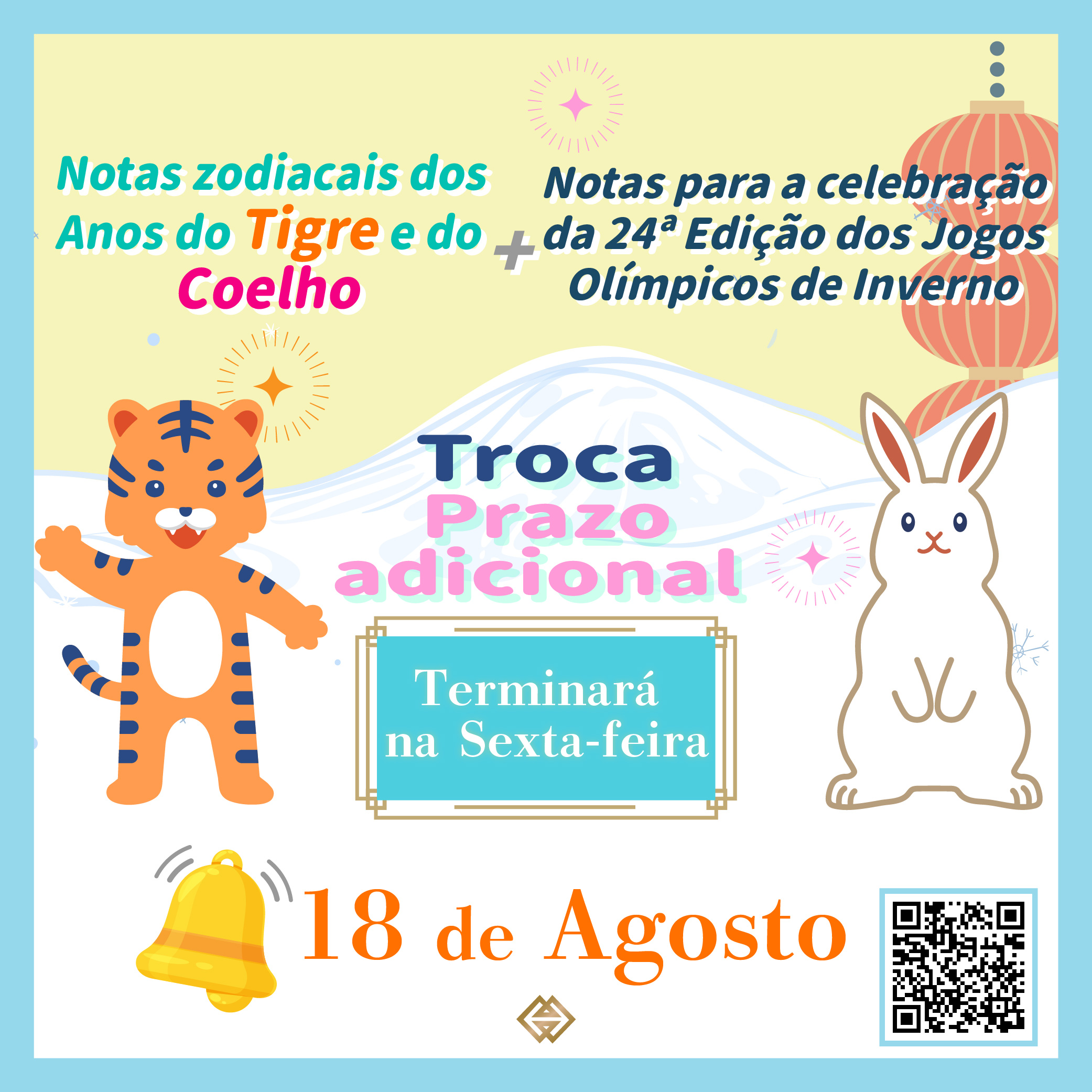 O termo do prazo adicional para troca das notas zodiacais dos Anos do Tigre e do Coelho e das notas para a celebração da 24ª Edição dos Jogos Olímpicos de Inverno decorrerá até 18 de Agosto de 2023 (Sexta-feira), a AMCM informa que os residentes que procederam à subscrição “on-line” e que não efectuaram a troca das mesmas devam proceder, até ao termo do prazo, à troca das notas, nos locais de troca previamente escolhidos.