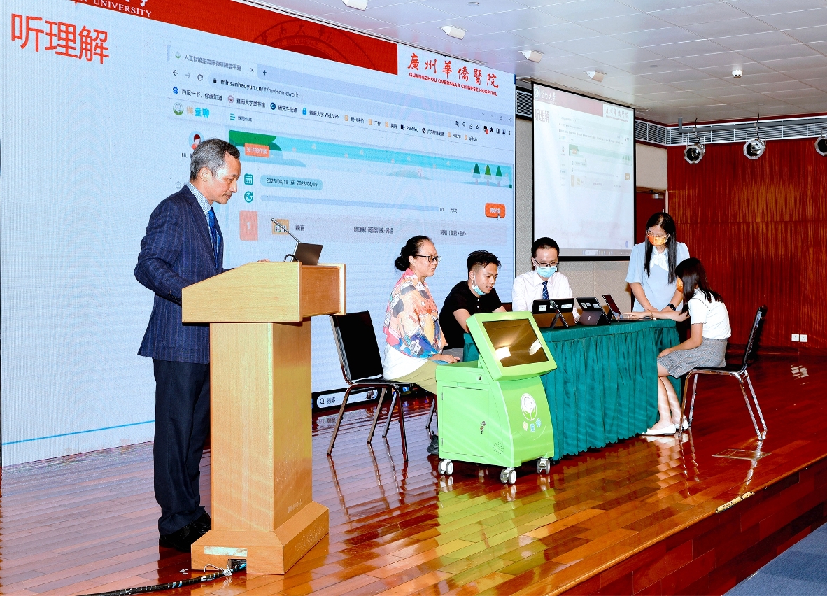 Posteriormente, o professor Chen Zhuoming apresentou o método operacional da plataforma de nuvem aos participantes e apontou o conteúdo da nova versão, através do ensino presencial e demonstrações ao vivo deste sistema. Também agradeceu muito o apoio e a confiança do Governo da RAEM, e a cooperação entre Guangdong e Macau na criação desta plataforma científica, eficiente e conveniente, que pode proporcionar um excelente sistema de apoio terapêutico às crianças com dificuldades de fala. Salientou que, através da rede de inteligência artificial, esta plataforma pode concretizar a integração de informações e avaliação de reabilitação, os procedimentos inteligentes de reabilitação e as formas de reabilitação interessante