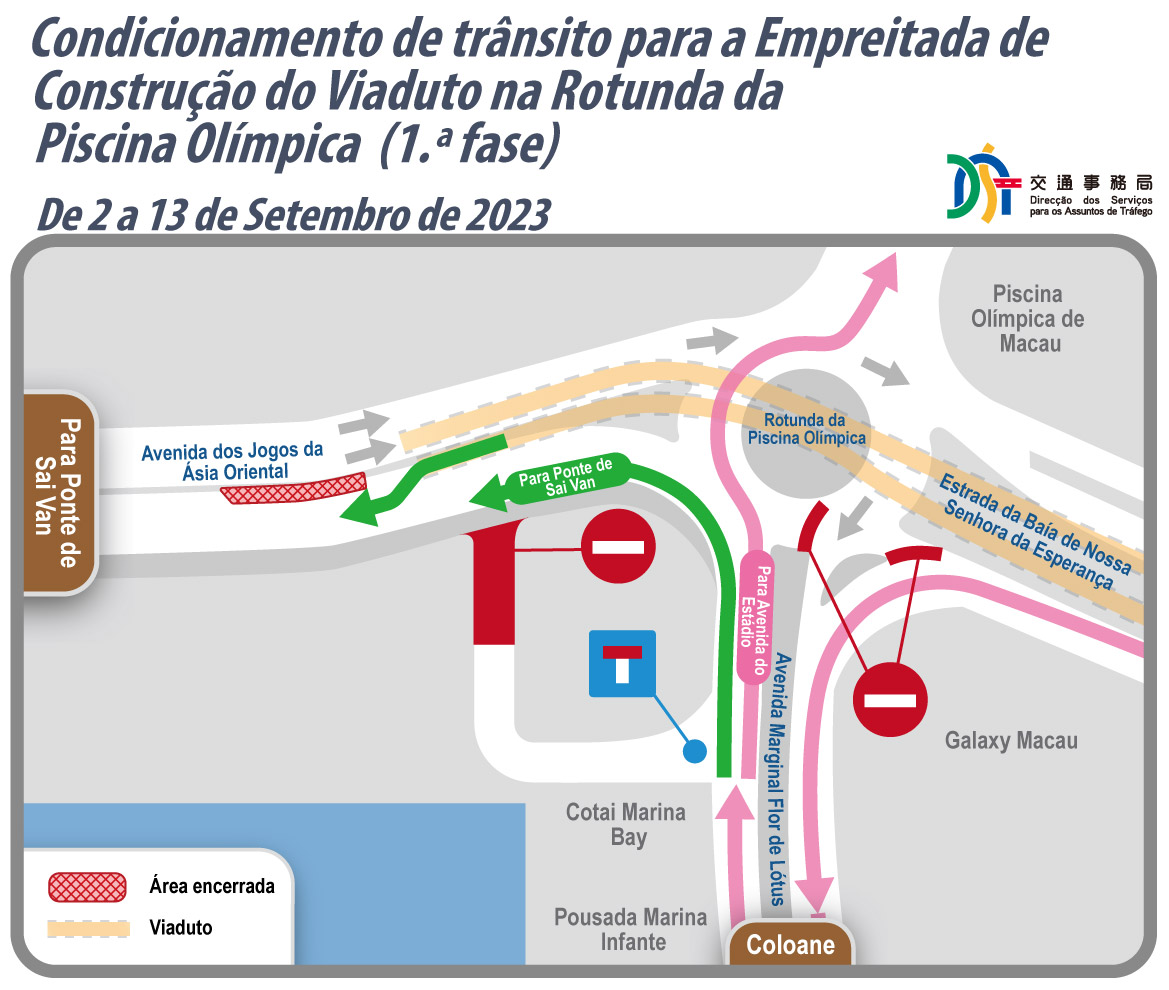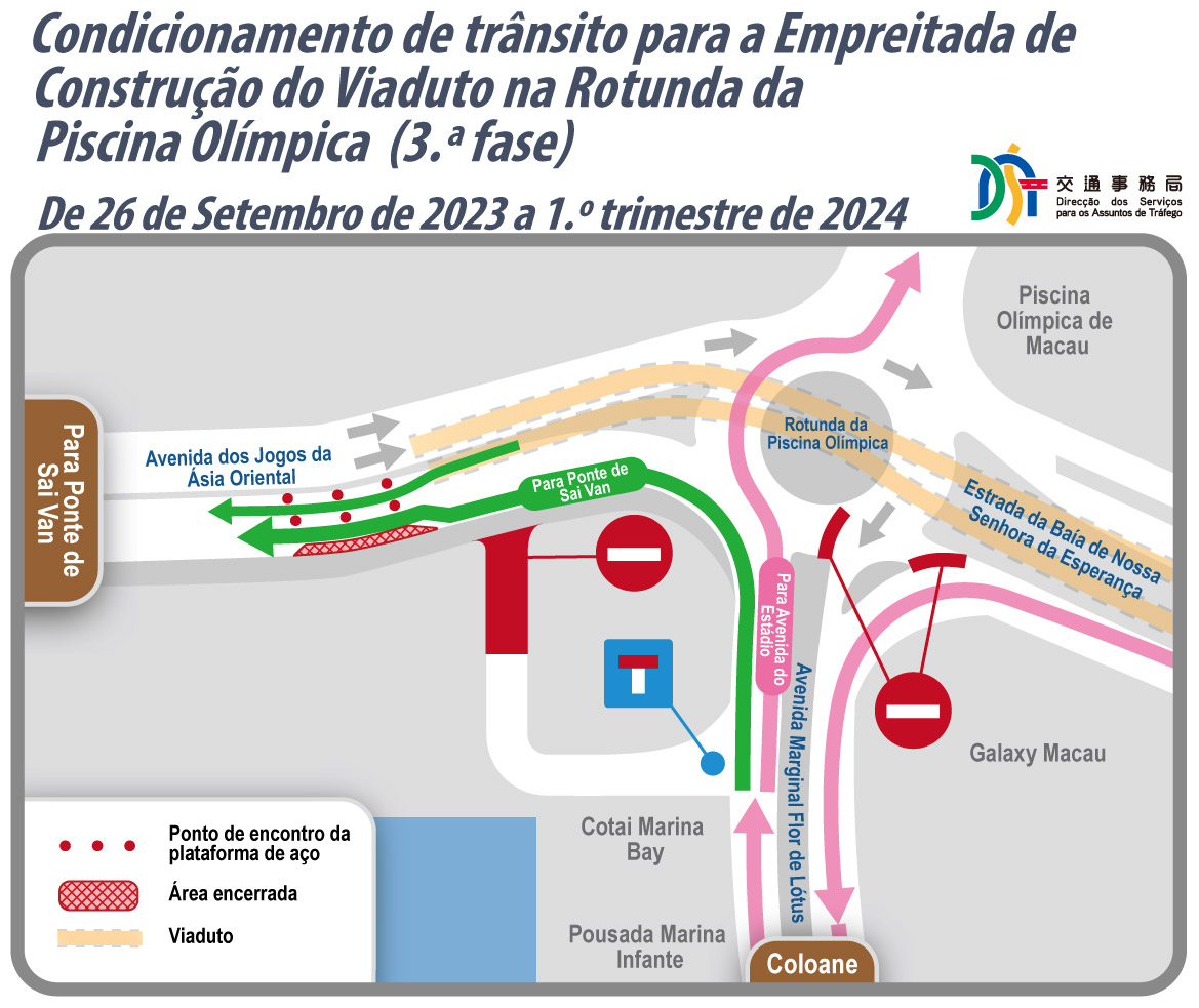 Em articulação com o avanço da empreitada de construção da rampa de acesso sudoeste do viaduto da Rotunda da Piscina Olímpica, é necessário construir uma plataforma provisória de aço no acesso do viaduto da Avenida dos Jogos da Ásia Oriental em direcção à Ponte de Sai Van para a execução da estrutura do pavimento entre dias 2 e 25 de Setembro de 2023, estando a conclusão da obra prevista para o 1.º trimestre de 2024. No referido período, serão implementadas, por troços, as medidas de circulação condicionada de veículos numa parte da Avenida dos Jogos da Ásia Oriental em direcção à Ponte de Sai Van. Por outro lado, as medidas provisórias de trânsito na Rotunda da Piscina Olímpica e o ajustamento provisório relativo aos autocarros mantêm-se até à conclusão dos trabalhos de desmontagem da plataforma de aço, repondo posteriormente a situação inicial.