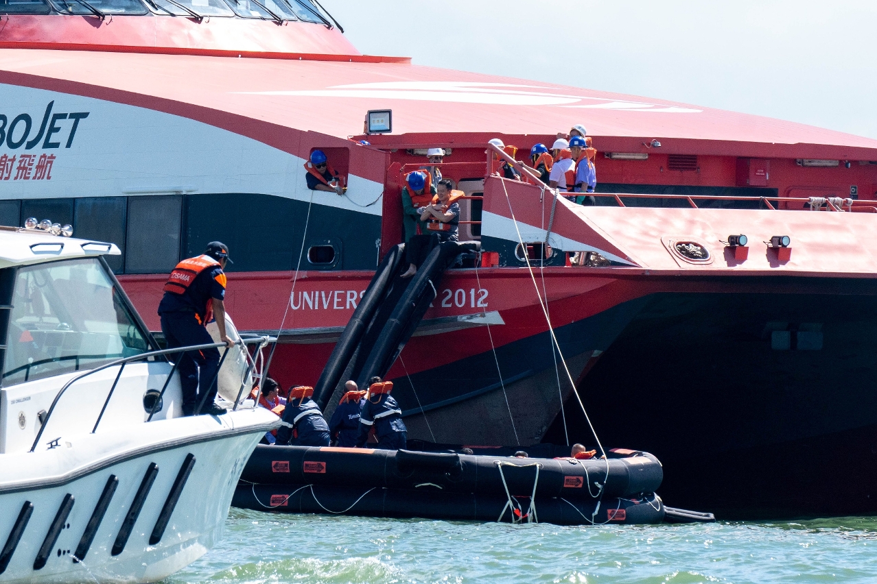Tendo recebido a notificação do acidente, a Direcção dos Serviços de Assuntos Marítimos e de Água de Macau actuou imediatamente conforme o “Plano de contingência para acidentes no mar”, activando imediatamente o Centro Coordenador de Busca e Salvamento Marítimo de Macau para comandar as operações de salvamento. Tendo em conta a gravidade do acidente, a Direcção dos Serviços de Assuntos Marítimos e de Água de Macau notificou as unidades de busca e salvamento marítimo de Guangdong e de Hong Kong para participarem nas operações. Após a chegada das embarcações dos Serviços de Alfândega de Macau e da Direcção dos Serviços de Assuntos Marítimos e de Água de Macau de Macau, as pessoas da jangada pneumática foram transportadas para a lancha rápida dos Serviços de Alfândega e depois para a embarcação de salvamento “Sai Van” da Direcção dos Serviços de Assuntos Marítimos e de Água de Macau. Outras embarcações equipadas com canhões de água lançaram jactos de água para extinguir o fogo na embarcação de obras. Ainda foi simulado um cenário em que uma pessoa da jangada pneumática e uma pessoa da embarcação de obras caíram no mar, por isso, a lancha rápida dos Serviços de Alfândega de Macau e a embarcação não tripuladas enviada pela lancha de fiscalização de Zhuhai foram mobilizadas para salvá-las.
