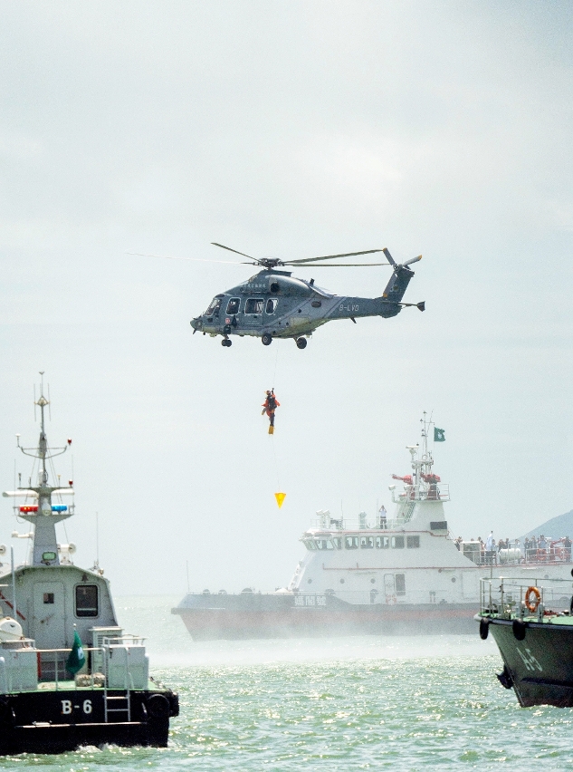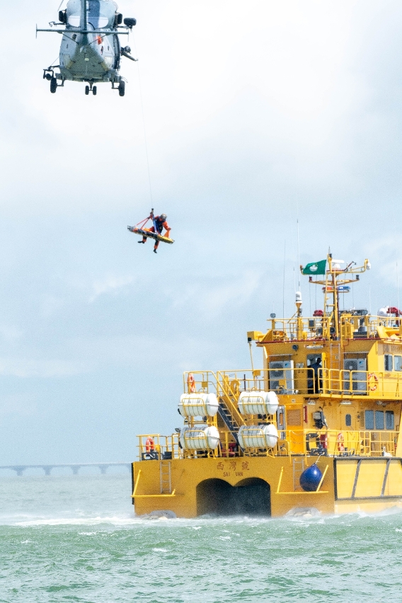 Quanto ao salvamento por via aérea, foi simulado o seguinte cenário: a pessoa da jangada pneumática, caiu no mar, foi salva e transportada pelos Serviços de Alfândega de Macau para a embarcação de salvamento “Sai Van”, depois, esta pessoa, com ferimento grave, foi transportada urgentemente pelo helicóptero de Hong Kong Government Flying Service da embarcação de salvamento “Sai Van” para o heliporto do Terminal Marítimo de Passageiros do Porto Exterior; a pessoa da embarcação de obras, que caiu no mar, foi salva no mar pelo helicóptero de Hong Kong Government Flying Service e transportada para o heliporto. O exercício terminou por volta das 11h30, contando com a participação de 14 embarcações, 1 helicóptero e mais de 130 pessoas. Durante o exercício, foram praticadas as acções de sobrevivência, busca e salvamento, bem como combate a incêndio no mar. O exercício decorreu sem sobressaltos e conforme o previsto.