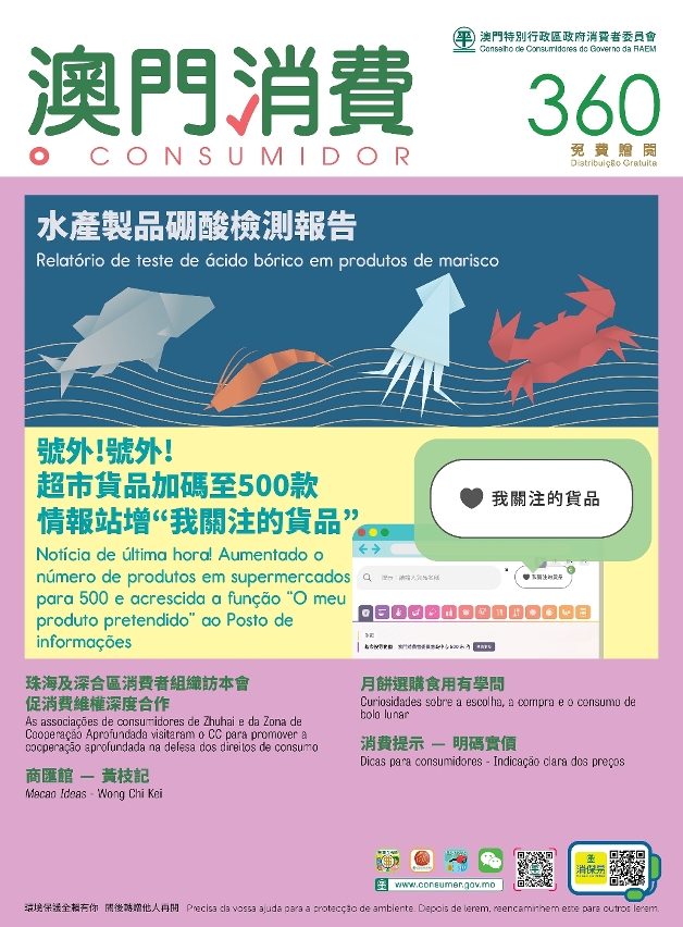 No boletim “O Consumidor” n.º 360, foi publicado o relatório do teste de ácido bórico em produtos de marisco, tendo sido aprovadas todas as amostras. Foi apresentada também a função acrescentada do “Posto de Informações de Preços de Macau” (adiante designado por “Posto de Informações”), que facilita aos consumidores a pesquisa rápida de bens a preço mais reduzido em supermercados.
