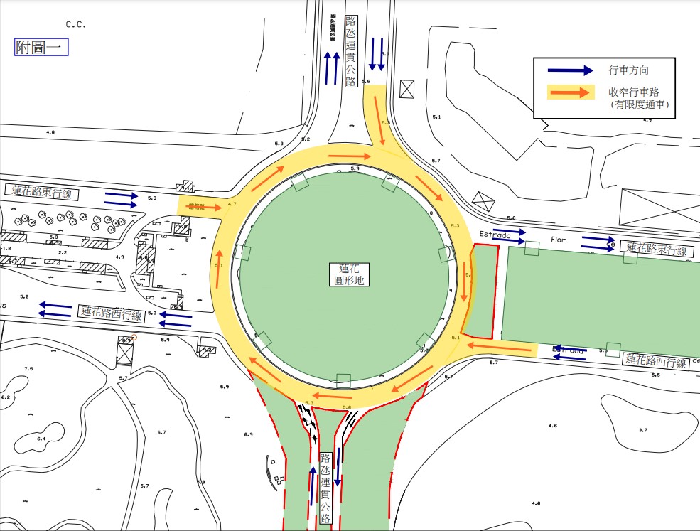 1. Durante o período compreendido entre 22 de Setembro de 2023 e 31 de Dezembro de 2023, para articular com as necessidades da execução da obra, serão implementadas as medidas de condicionamento ao trânsito em toda a Rotunda Flor de Lótus e, nessa altura, será mantida uma via de trânsito de forma faseada. Ao mesmo tempo, os entroncamentos da Estrada do Istmo e das vias no sentido leste e oeste da Estrada Flore de Lótus para a Rotunda Flor de Lótus serão estreitadas para efeitos de articulação com os respectivos trabalhos, e será mantida, pelo menos, 1 via de trânsito. (os detalhes encontram-se na “figura 1 em anexo”).