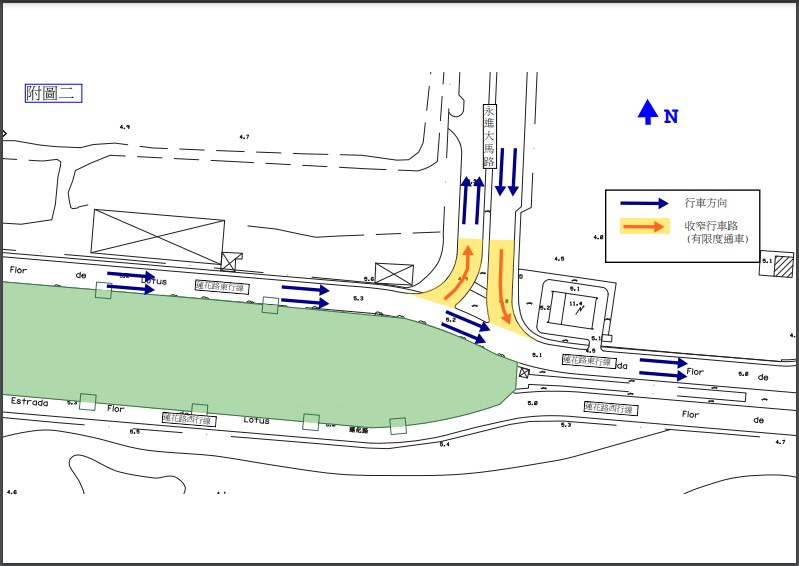 2. Durante o período compreendido entre 22 de Setembro de 2023 e 31 de Outubro de 2023, no troço da Estrada Flor de Lótus junto da Avenida do Progresso (em direcção à Rotunda da Central Térmica de Coloane), será encerrada parcialmente a via no sentido norte da Avenida do Progresso e serão implementadas medidas de condicionamento ao trânsito num troço da via no sentido sul junto da Estrada Flore de Lótus e, nessa altura, será mantida uma via de trânsito. (os detalhes encontram-se na “figura 2 em anexo”)