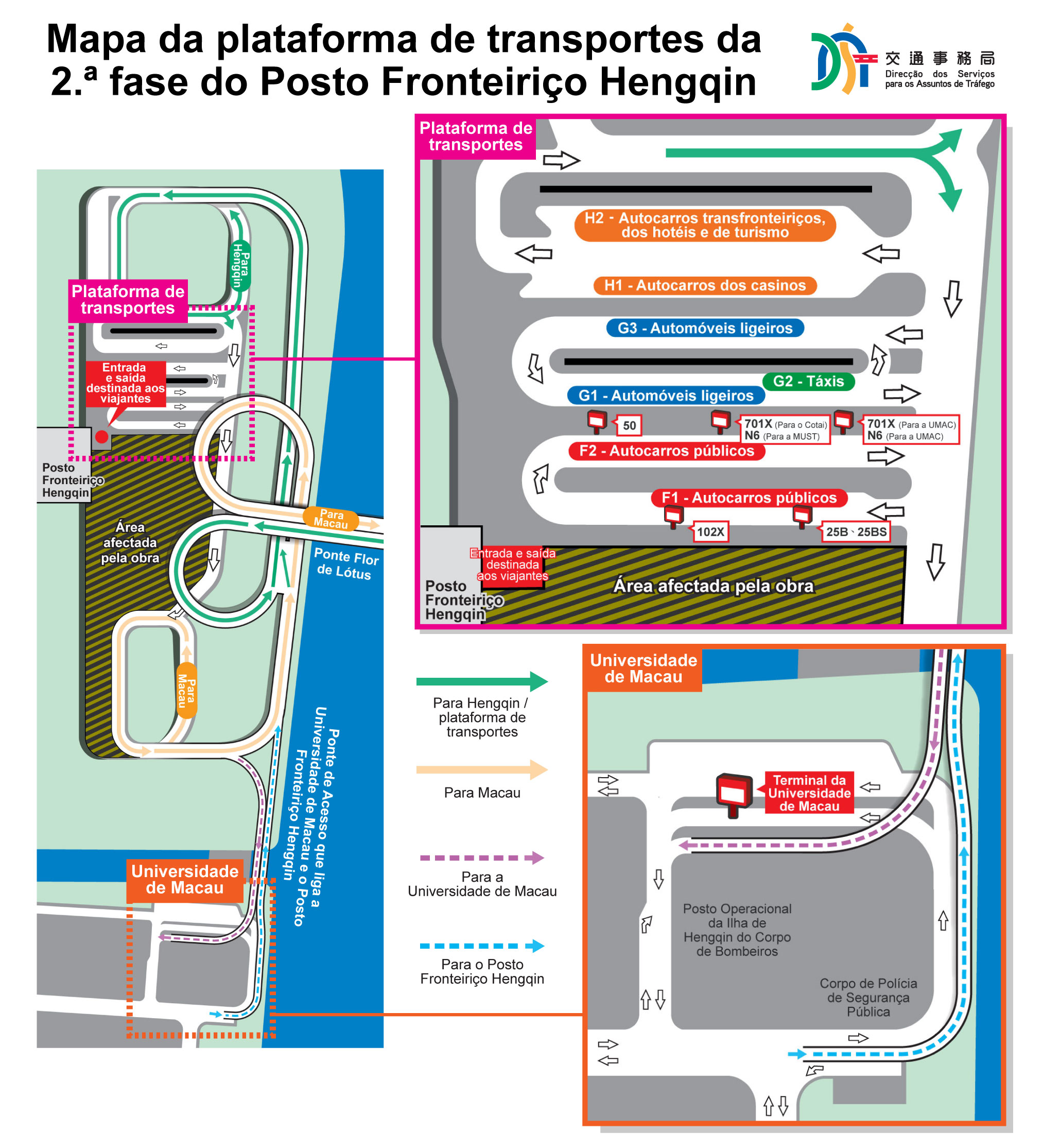 Quanto aos autocarros, a paragem de autocarros “Posto Fronteiriço de Macau em Hengqin” será deslocada para a plataforma de transportes supramencionada no dia 26 de Setembro, pelas 15h00, continuando a permitir a paragem das carreiras que passem pela paragem antiga. Ademais, a carreira de ligação n.º 701X, que funciona 24 horas por dia entre o Posto Fronteiriço de Macau em Hengqin e a Ponte Flor de Lótus, terá o seu âmbito de percurso alargado para abranger também o campus da Universidade de Macau e a zona de COTAI. A carreira nocturna n.º N6, por outro lado, irá estender o itinerário até a zona do posto fronteiriço, a fim de satisfazer as necessidades de deslocação do público e dos turistas durante o período nocturno. Para mais informações, queira consultar a tabela anexa e as páginas electrónicas das duas companhias de autocarros (www.tcm.com.mo e www.transmac.com.mo).