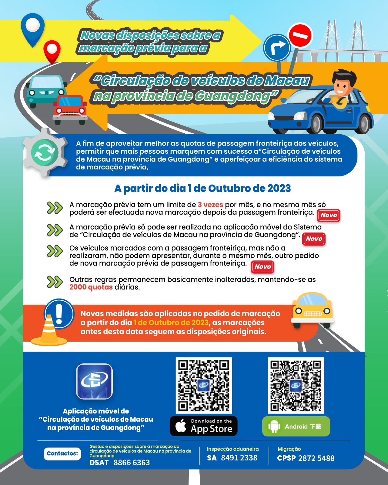 Apelando ao público a fazer bom uso desta política de benefícios, cooperar com o pessoal do posto fronteiriço, cumprir as regras e manter a boa ordem de passagem; Além disso, ao utilizar esta política em benefício do público, não infrinja a lei incorrendo nas consequências correspondentes. O público também podem descarregar a aplicação “Serviços de Alfândega da RAEM” no website dos SA (https://www.customs.gov.mo/) para verificar instantaneamente o estado da passagem fronteiriça de cada posto fronteiriço terrestre em tempo real, podendo também utilizar as aplicações “Macau Smart Go” ou “Posto de Informação de Tráfego” para consultar as condições do trânsito em tempo real.