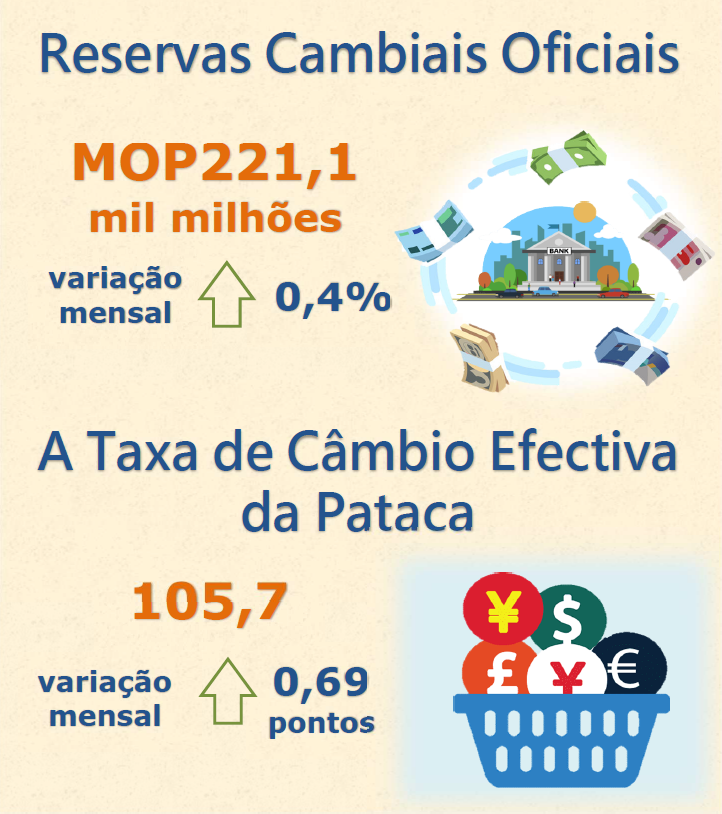 A taxa de câmbio efectiva da pataca, ponderada pelas suas quotas do comércio, foi de 105,7 em Outubro de 2023, registaram crescimento de 0,69 pontos e decrescimento de 2,22 pontos, respectivamente, em comparação com os dados registados no mês anterior e os reportados a Outubro de 2022, implicando que globalmente, a pataca subiu mensalmente face às moedas dos principais parceiros comerciais de Macau, mas caiu anualmente.
