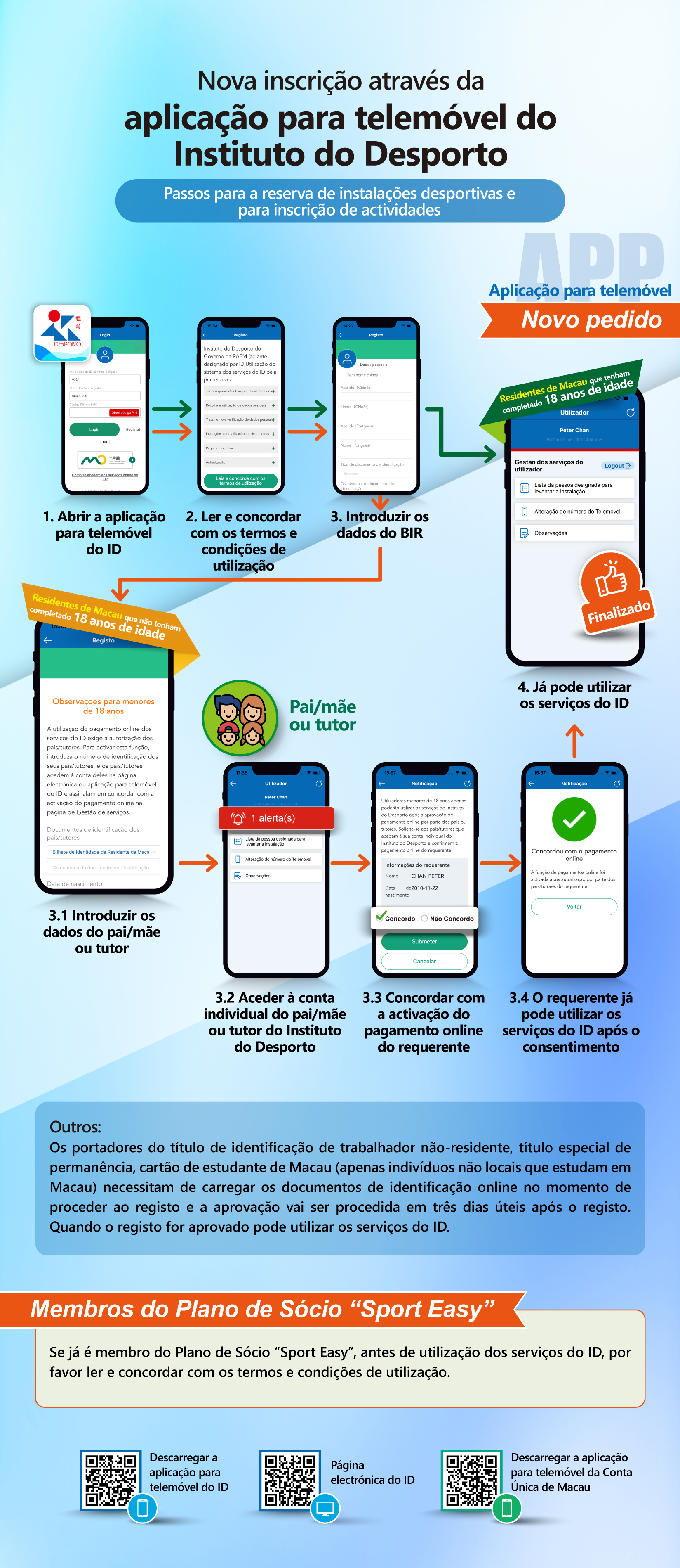 A partir de 22 de Novembro, os residentes só necessitam de seguir os passos online usando o seu documento de identificação (em anexo), não sendo necessário o requerente fazê-lo pessoalmente, nem ter cartão de sócio “Sport Easy” para poder usufruir dos serviços do ID, nomeadamente, compra antecipada online de bilhetes para entrada nas piscina, compra online de bilhetes para entrada imediata nas piscinas, compra antecipada online de bilhetes de outras instalações desportivas e inscrição nas classes de recreação e manutenção do Desporto para Todos.