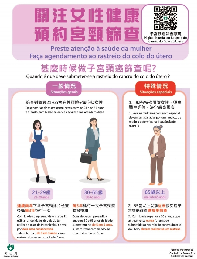 Os Serviços de Saúde afirmam que o cancro do colo do útero é o quarto cancro mais comum em mulheres em todo o mundo. Este é um tumor maligno que ocorre no colo do útero, derivado do crescimento de forma descontrolada das células. Normalmente, o corpo consegue eliminar as células anormais e o colo do útero volta ao normal. Mas, por vezes, isso não acontece e as células anormais podem evoluir para o cancro. Segundo um estudo global, o papilomavírus humano (adiante designado por HPV) é o único factor explícito que causa o cancro do colo do útero, e quase 100% do cancro do colo do útero está relacionado com a infecção contínua do vírus HPV de alto risco. Os Serviços de Saúde salientam que o cancro do colo do útero é uma doença evitável e, actualmente, as medidas mais eficazes de prevenção e controlo do cancro do colo do útero, reconhecidas pela Organização Mundial de Saúde (OMS), são a vacinação contra o cancro do colo do útero (vacina contra o HPV) e a realização periódica do exame de rastreio do cancro do colo do útero. A par disso, devem prestar atenção à adopção de estilos de vida saudável, incluindo descanso regular, exercício físico regular, alimentação saudável, evitar fumar ou deixar de fumar, evitar ter múltiplos parceiros sexuais e usar correctamente o preservativo.
