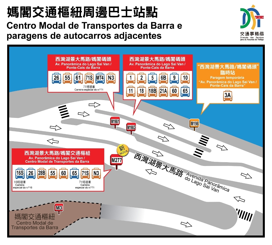 - Criação de uma nova paragem de autocarros na berma do rés-do-chão do Centro Modal de Transportes da Barra, designada por “Avenida Panorâmica do Lago Sai Van/ Centro Modal de Transportes da Barra”, destinada à paragem da carreira especial de 16 (16S), das carreiras n.os 26, 28B, 55, 60 e 65, da carreira especial de 71 (71S) e da carreira n.º N3;