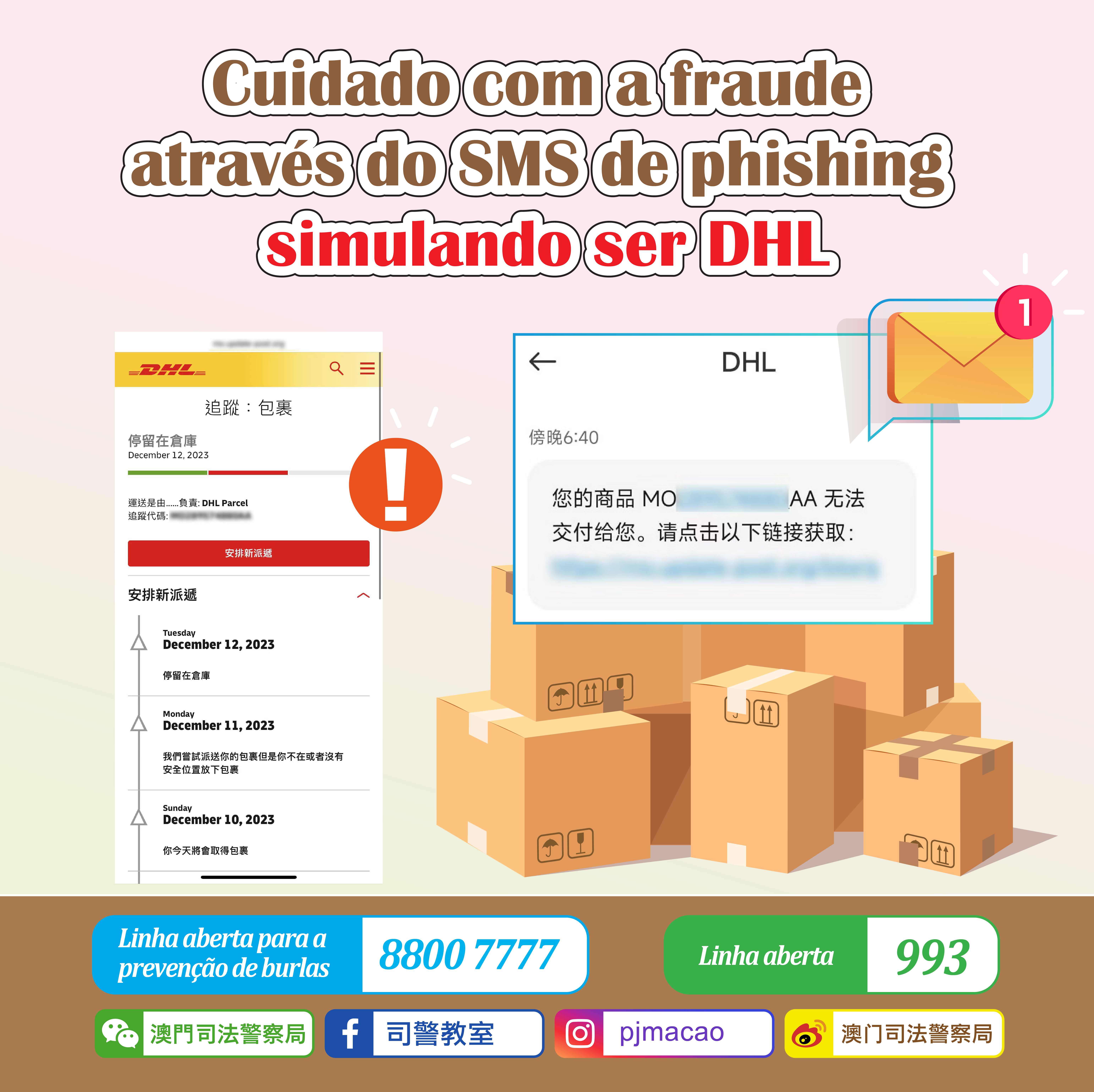 Ultimamente, a PJ recebeu várias denúncias de burlas feitas através do SMS de phishing que simula ser uma empresa de correio rápido, a DHL. Segundo as vítimas, o texto deste SMS refere que para levantar uma encomenda, as mesmas preci sariam de pagar a taxa postal e, para tal, pedia-lhes que seguissem um link e ali fornecessem os dados pessoais do cartão de crédito.