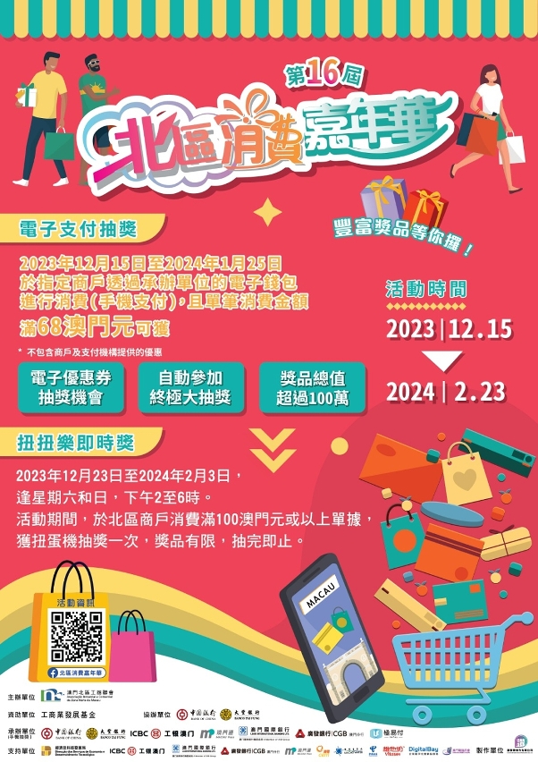 O “16º Carnaval de Consumo na Zona Norte 2023”, organizado pela Associação Industrial e Comercial da Zona Norte de Macau e subsidiado pelo Fundo de Desenvolvimento Industrial e de Comercialização, decorre entre 15 de Dezembro de 2023 e 23 de Fevereiro de 2024. O evento tem por objectivo optimizar o ambiente de negócios da Zona Norte, promover a economia comunitária e impulsionar a integração dos empresários e residentes. Pretendendo-se que, através desta actividade, manter a dinâmica de consumo e aumentar a procura interna, de modo a levar o fluxo de clientes para as lojas e promover o ciclo de consumo nos bairros comunitários. O evento conta com a participação e apoio de cerca de 7.000 estabelecimentos comerciais na zona, combinando os prémios de consumo online e offline, os espectáculos culturais e recreativos com características próprias e o sorteio final com prémios abundantes, espera-se que possa atrair mais pessoas para a Zona Norte e aumentar as receitas globais das lojas naquela zona, dinamizando assim a economia dos bairros comunitários.