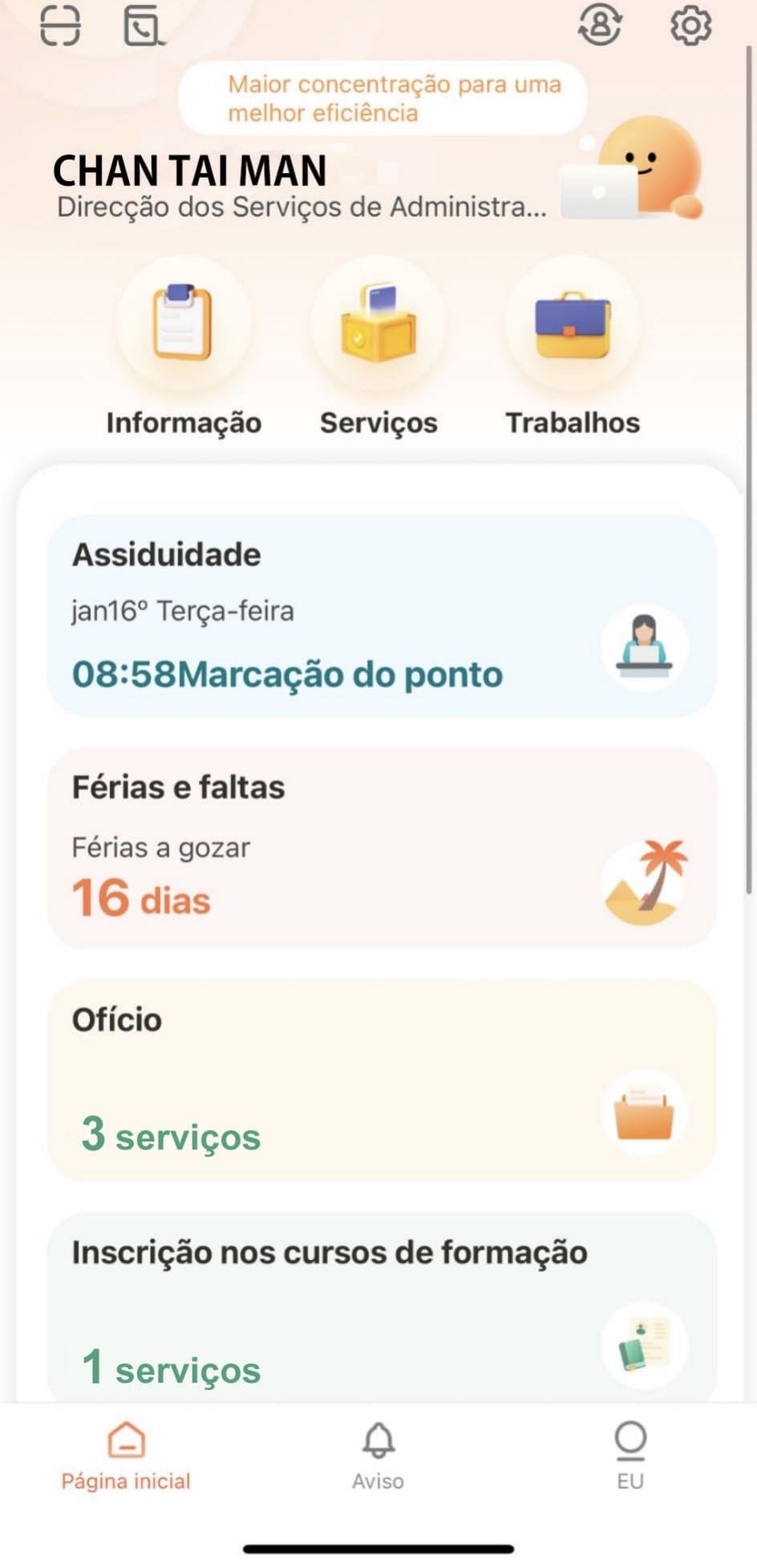 Depois de aceder aos “Assuntos Governamentais”, os trabalhadores podem consultar imediatamente o registo de assiduidade, a nota de abonos e descontos electrónica, assim como efectuar, por via electrónica, o pedido de férias ou a participação de faltas, declaração de prestação de trabalho extraordinário, inscrição em cursos de formação, apresentação de atestado médico, requerimento de subsídio de nascimento e de casamento, tratar das formalidades do serviço “eMudança” do Regime de Previdência, envio e recepção de documentos oficiais, elaborar ofícios electrónicos ou efectuar transmissão de documentos oficiais, entre outras tarefas.