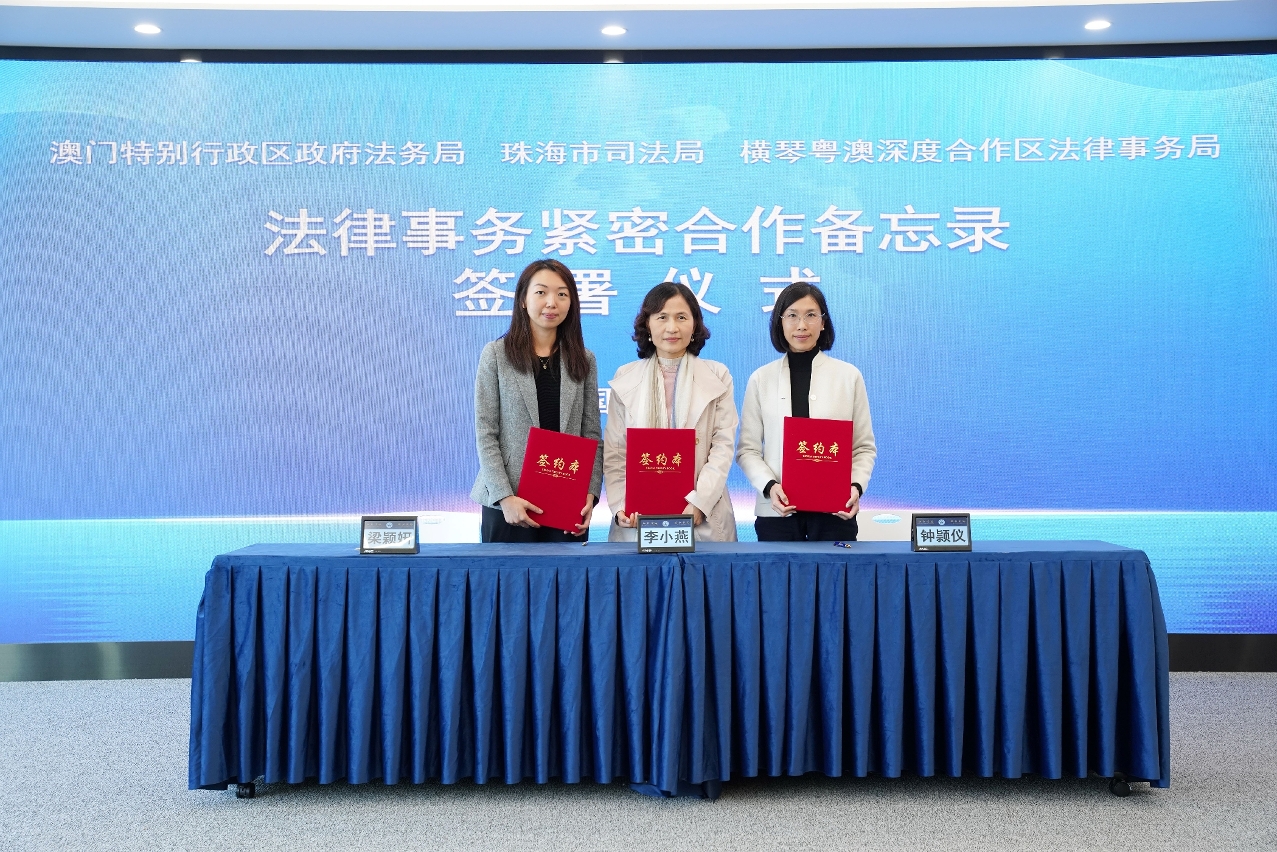 Hoje (dia 18), a Directora dos Serviços de Assuntos de Justiça do Governo da RAEM, Leong Weng In, a Directora do Departamento de Justiça de Zhuhai, Li Xiaoyan, e a Directora dos Serviços de Assuntos Jurídicos da Zona de Cooperação Aprofundada entre Guangdong e Macau em Hengqin, Carmen Maria Chung, assinaram conjuntamente, em Hengqin, o Memorando sobre a Cooperação Estreita nos Assuntos Jurídicos entre a Direcção dos Serviços de Assuntos de Justiça do Governo da RAEM, o Departamento de Justiça de Zhuhai e a Direcção dos Serviços de Assuntos Jurídicos da Zona de Cooperação Aprofundada entre Guangdong e Macau em Hengqin. Este é o primeiro memorando de cooperação a celebrar pelos serviços jurídicos das três partes, onde foi determinada a cooperação entre as três partes no âmbito do intercâmbio legislativo, apoio jurídico, divulgação do Estado de Direito, formação de talentos, entre outros. É criado ainda o mecanismo para reunião conjunta, a fim de impulsionar ainda mais o desenvolvimento da integração dos assuntos jurídicos regionais, promovendo a integração do ambiente do Estado de Direito transfronteiriço e a articulação dos serviços jurídicos relacionados com o exterior, em prol da implementação das «Linhas Gerais do Planeamento para o Desenvolvimento da Grande Baía Guangdong-Hong Kong-Macau» e do «Projecto Geral de Construção da Zona de Cooperação Aprofundada entre Guangdong e Macau em Hengqin».