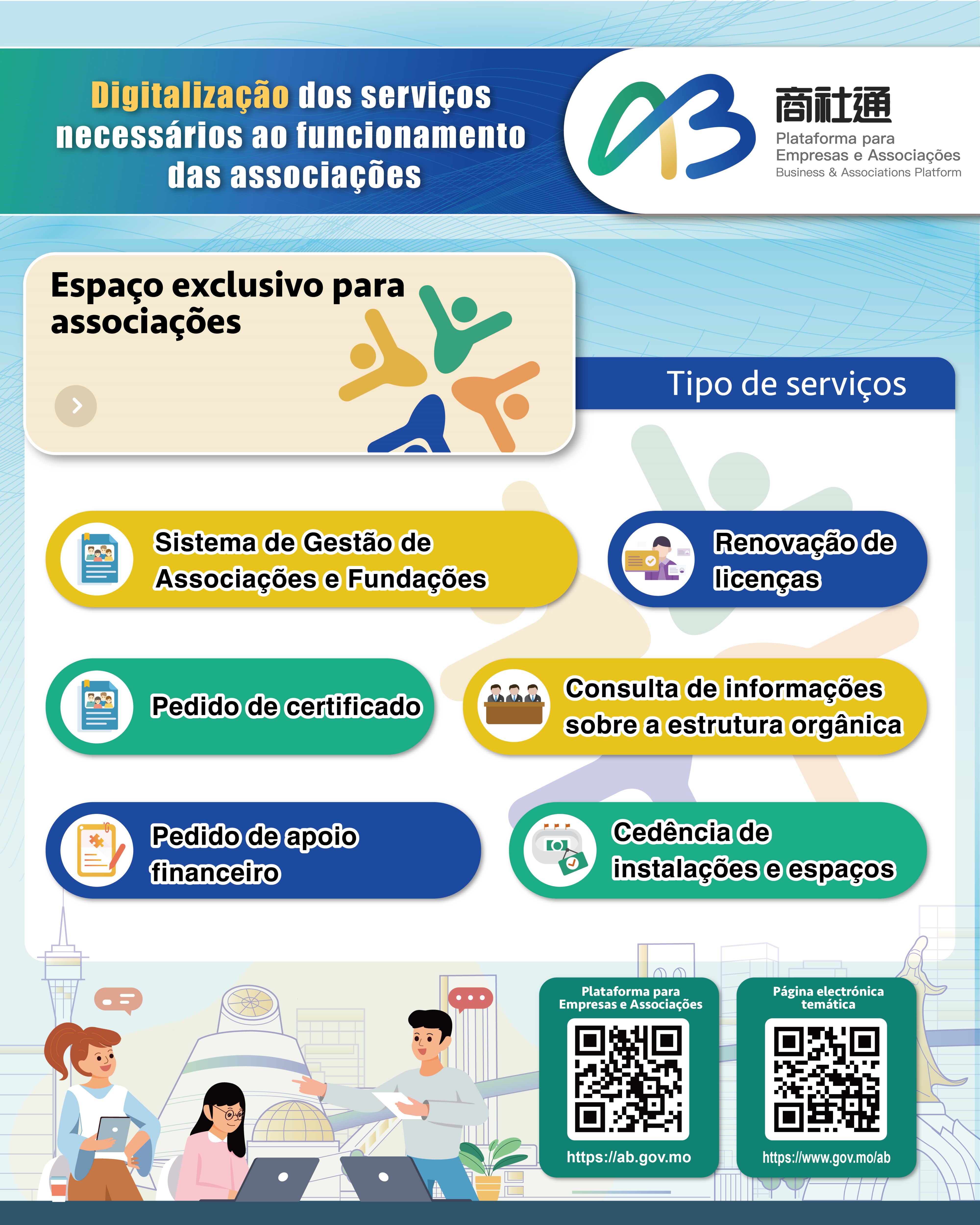 - Espaço exclusivo para associações: Para facilitar as associações na procura e no tratamento de assuntos administrativos relacionados com o seu funcionamento, este espaço dispõe de um sistema de gestão de associações e fundações e de serviços mais frequentes, como o pedido de certificados (incluindo o certificado de inscrição e o certificado de composição dos órgãos sociais), a consulta dos titulares dos órgãos sociais da respectiva associação ou fundação, o requerimento de apoio financeiro, a reserva de espaços e instalações, bem como, a inscrição em actividades.