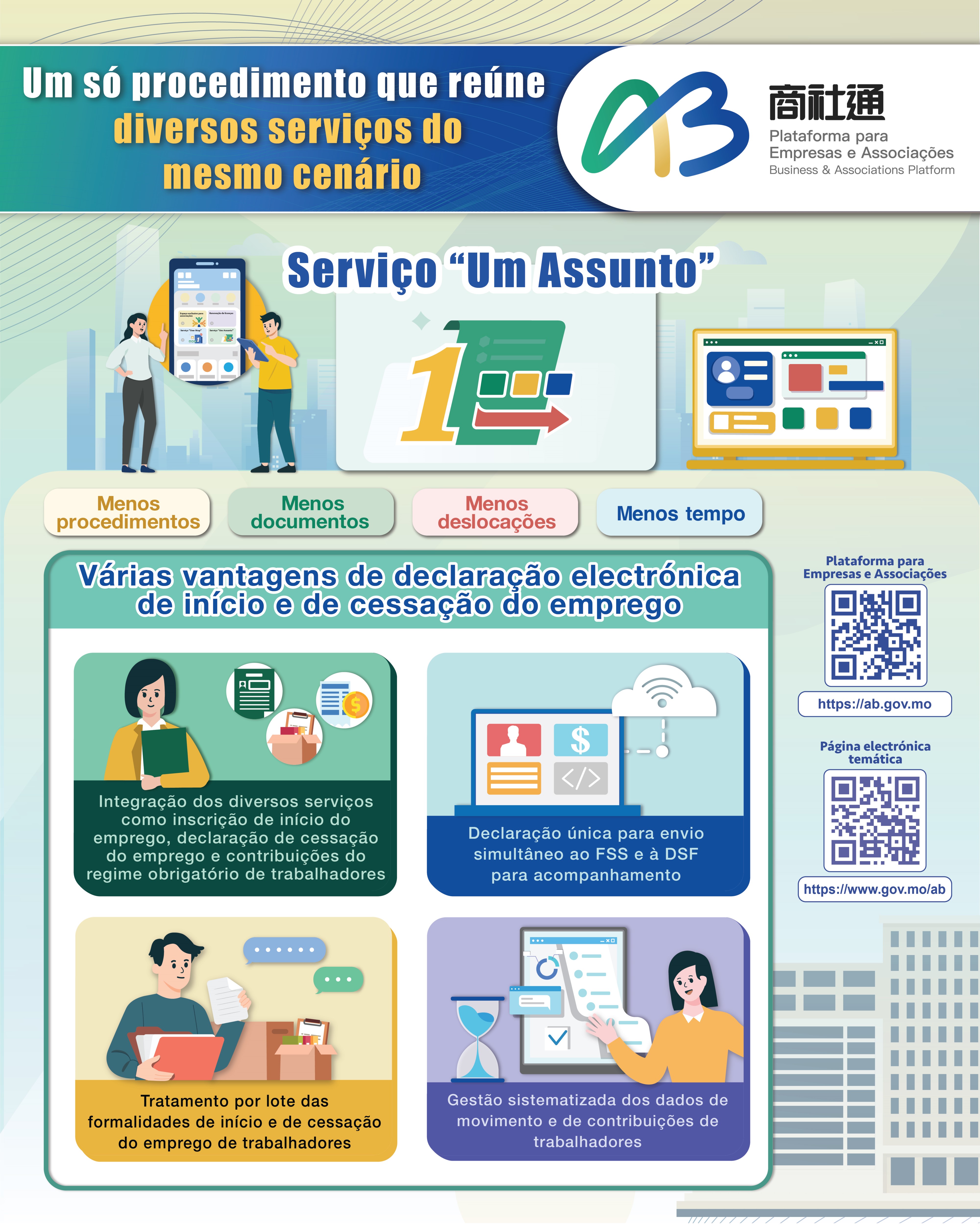 - Um assunto: São agrupados os diversos serviços do mesmo cenário num único pedido. Neste espaço pode ser tratada a declaração de início ou cessação do emprego do trabalhador via online, bastando efectuar uma única declaração, que será enviada, em simultâneo, à Direcção dos Serviços de Finanças e ao Fundo de Segurança Social para fins procedimentais. É permitida, ainda, às empresas uma gestão sistemática dos dados dos empregados, simplificando os respectivos procedimentos.