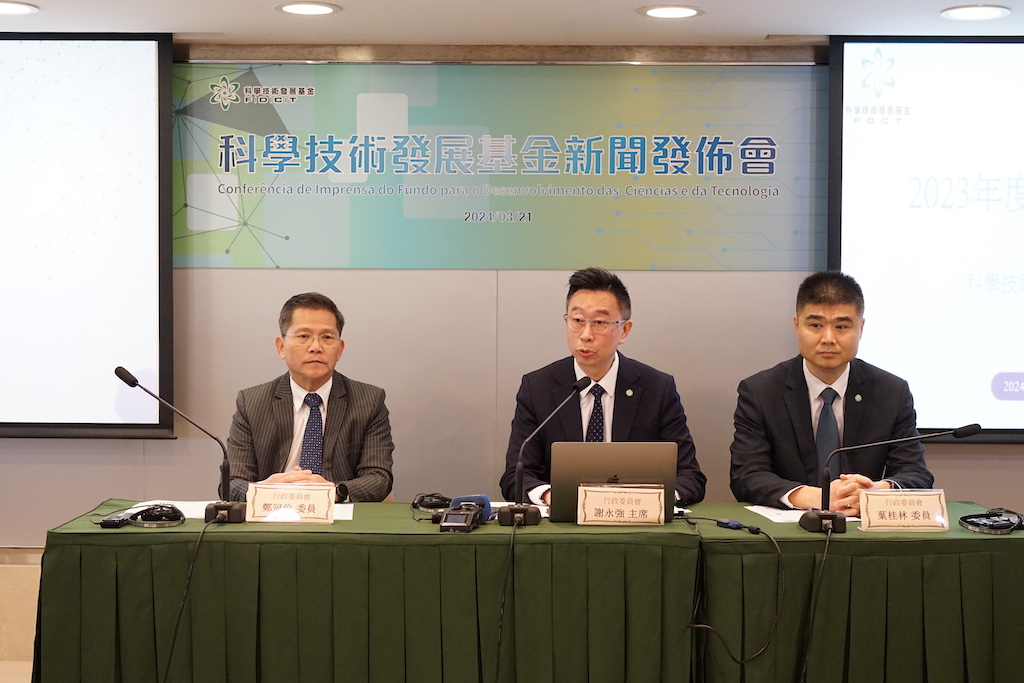 Na conferência de imprensa do relatório de trabalho anual do FDCT, realizada hoje (dia 21), o Presidente do Conselho de Administração, Che Weng Keong e os membros do mesmo Conselho, Cheang Kun Wai e Ip Kuai Lam, relataram o trabalho, respectivamente.
