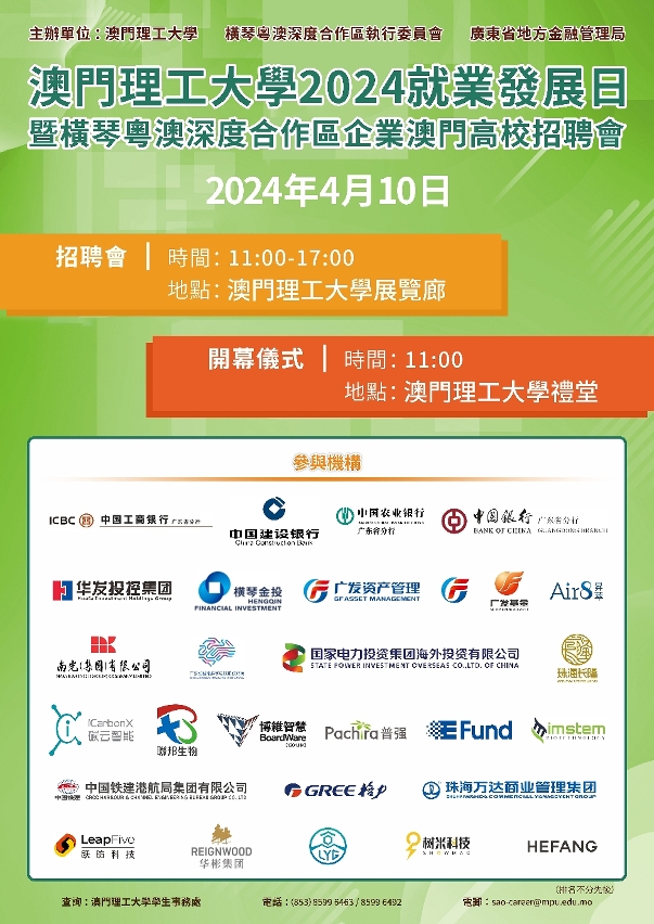 Em articulação com o desenvolvimento da diversificação adequada da economia de Macau “1+4” e a construção do “Projecto Geral de Construção da Zona de Cooperação Aprofundada entre Guangdong e Macau em Hengqin”, a Universidade Politécnica de Macau (UPM), a Comissão Executiva da Zona de Cooperação Aprofundada entre Guangdong e Macau em Hengqin e a Autoridade de Supervisão Financeira da Província de Guangdong co-organizarão o “Dia das Carreiras 2024 da Universidade Politécnica de Macau e Feira de Recrutamento nas Instituições de Ensino Superior para as Empresas na Zona de Cooperação Aprofundada entre Guangdong e Macau em Hengqin”. A feira de recrutamento terá lugar na UPM no dia 10 de Abril de 2024 (Quarta-feira), com a participação de 28 empresas de renome da Zona de Cooperação Aprofundada que disponibilizarão vagas de recrutamento e estágio nas áreas de ciência e tecnologia, finanças, medicina, cultura e turismo, entre outras, sendo bem-vinda a participação de todos os estudantes do ensino superior e jovens de Macau.