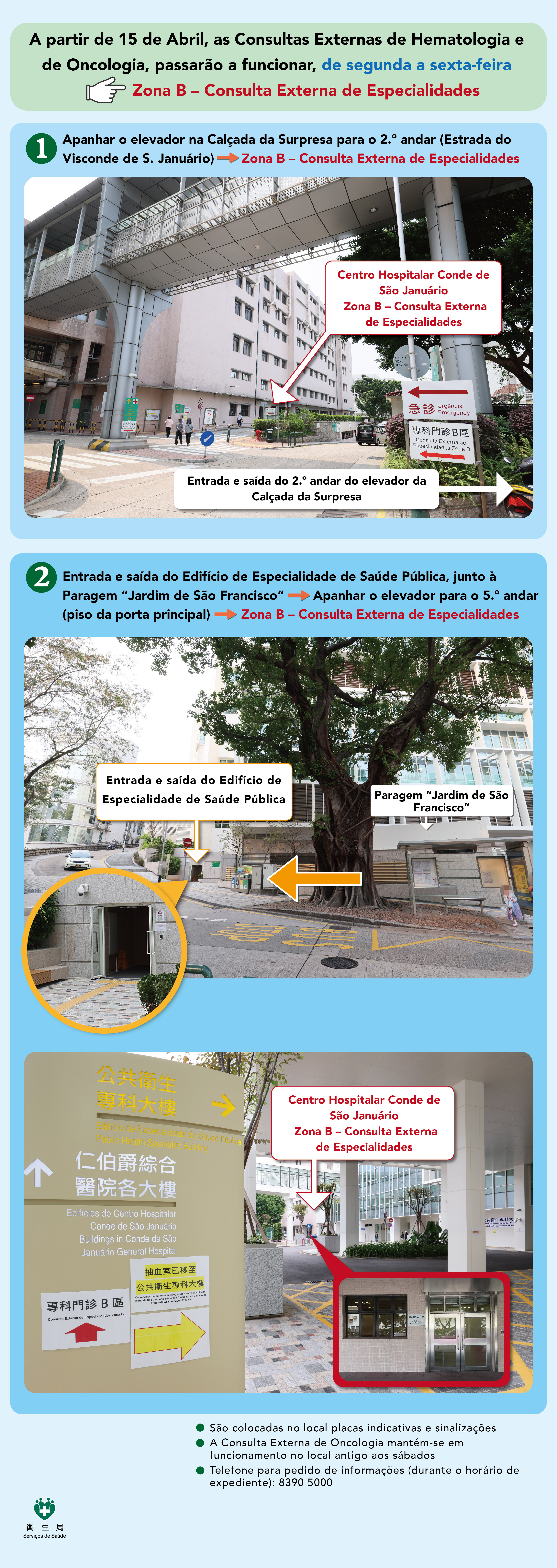 Com vista a optimizar, de forma contínua, os serviços das Consultas Externas de Hematologia e de Oncologia do Centro Hospitalar Conde de São Januário (CHCSJ) dos Serviços de Saúde (SS), e proporcionar aos utentes um ambiente de consulta mais confortável e independente, bem como a atender às necessidades crescentes de serviços de tratamento oncológico, a partir de 15 de Abril (próxima segunda-feira), o funcionamento destes serviços passará a ter o seguinte ajustamento:
