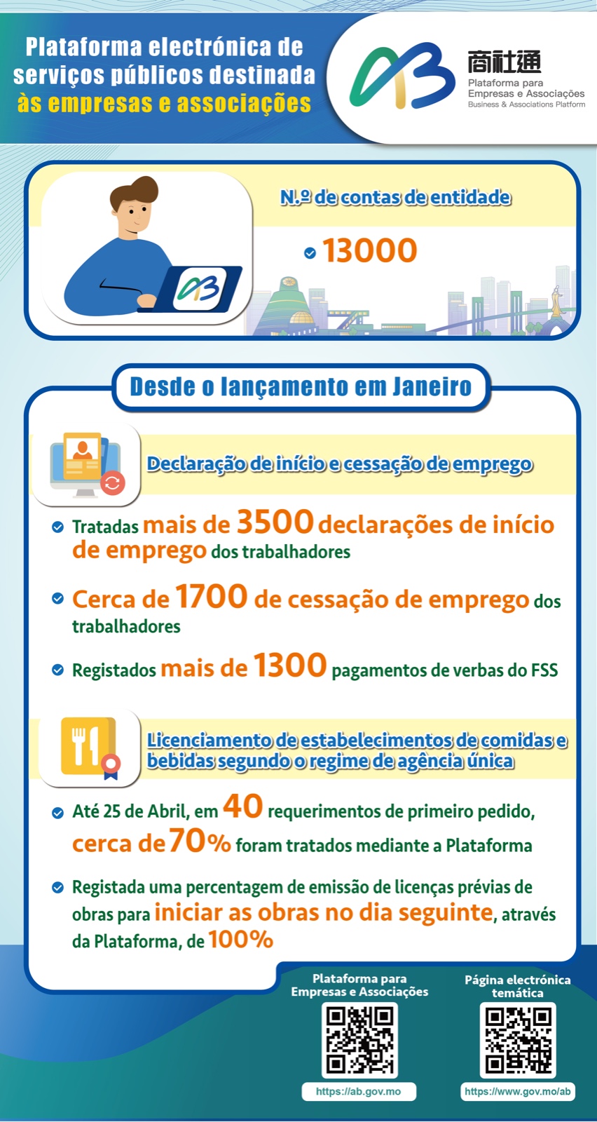 O Governo da RAEM lançou, no dia 9 de Janeiro de 2024, a plataforma de serviços denominada “Plataforma para Empresas e Associações”, a qual visa “reunir empresas e associações numa única plataforma para fins procedimentais”, proporcionando os serviços públicos electrónicos necessários ao estabelecimento, funcionamento e desenvolvimento das empresas e das associações. Após o seu lançamento, a “Plataforma para Empresas e Associações” tem sido alvo de grande adesão por parte das empresas e associações, contando, actualmente, com cerca de 13 000 contas de entidade e tendo já recebido mais de 3000 pedidos de abertura de conta apresentados por entidades.
