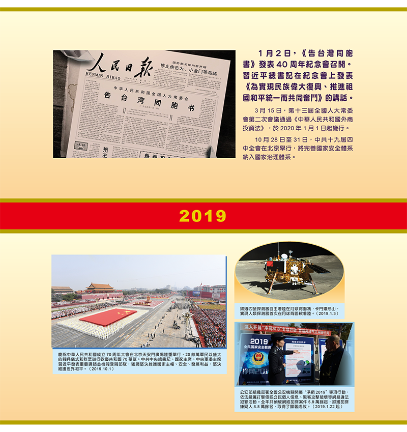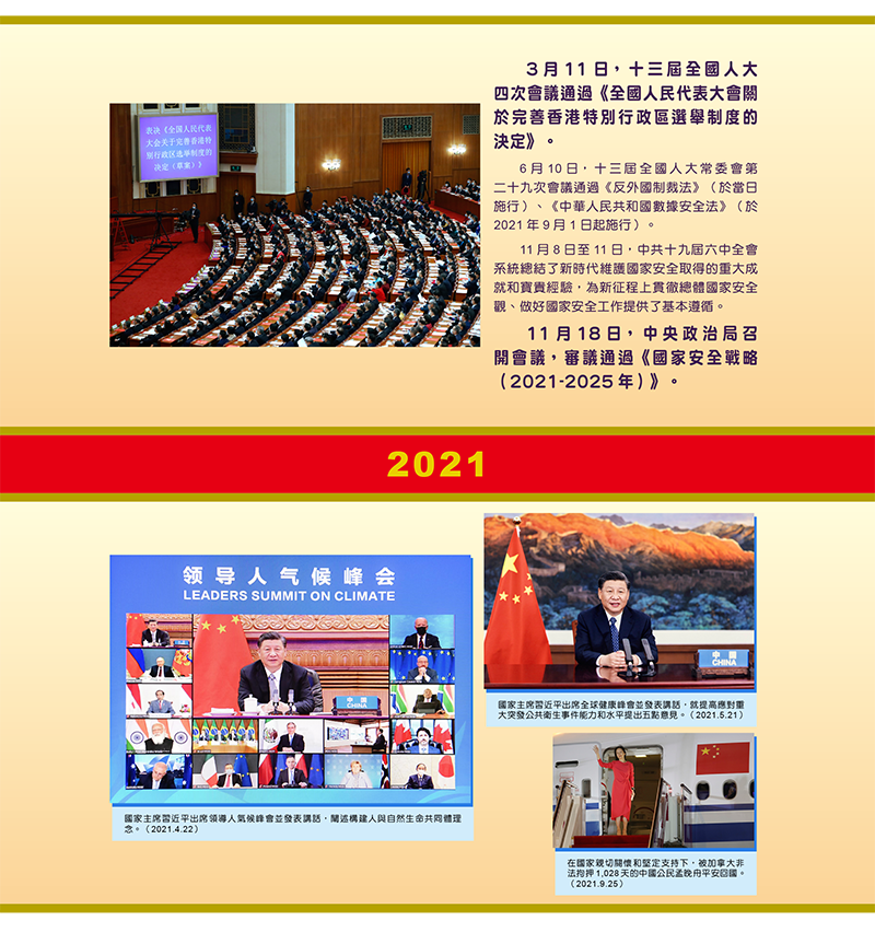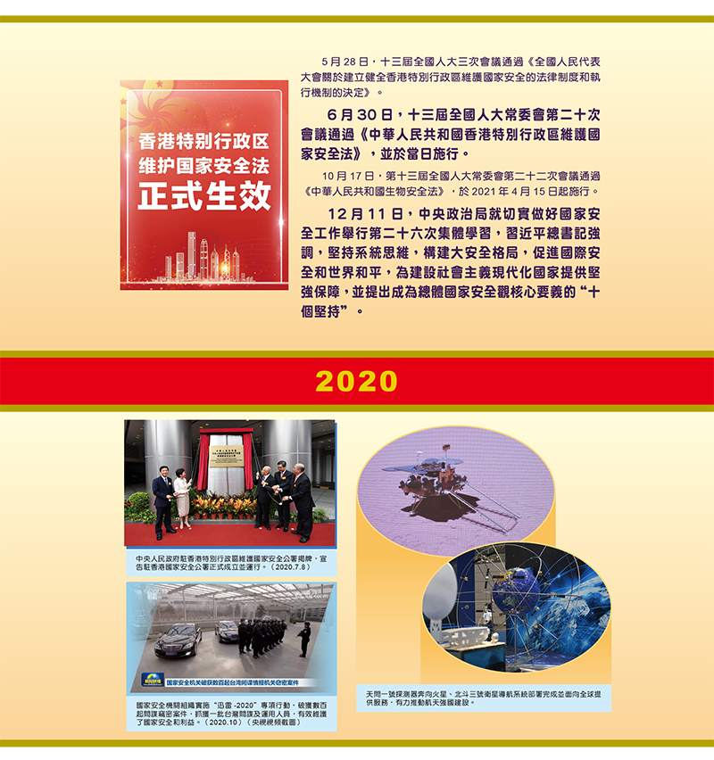 A exposição deste ano é composta por um prefácio e cinco partes temáticas, sendo a segunda subordinada ao tema «Criar de forma abrangente uma segurança de alto nível, promover de forma sólida um desenvolvimento de alta qualidade». A defesa da segurança nacional é a maior prioridade, razão pela qual no dia 15 de Abril de 2014, o Presidente Xi Jinping, com toda a perspicácia, apresentou a «Perspectiva Geral da Segurança Nacional», indicando a direcção para a segurança nacional na nova era.