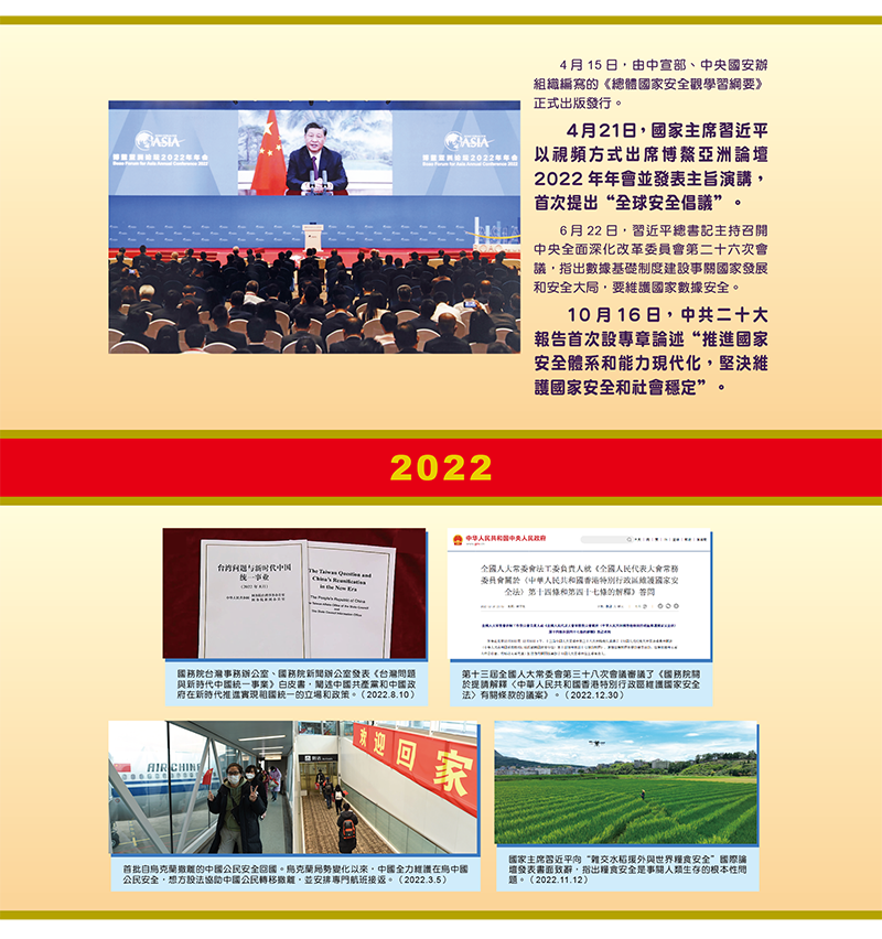 Actualmente, a situação de segurança nacional torna-se cada vez mais severa e complexa, tanto no contexto interno como externo, pelo que devemos implementar uma perspectiva geral com toda a firmeza, para a prevenção e a solução de grandes riscos, e criar uma segurança de alto nível, no sentido de assegurar um desenvolvimento de alta qualidade, e fornecer uma base sólida e segura para a promoção abrangente da construção de um país forte e da grande revitalização da Nação chinesa.