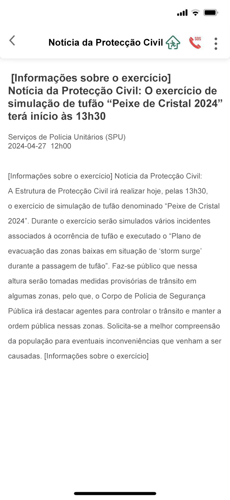 Tendo em conta a aproximação da época de tufões e, para que os cidadãos fiquem mais familiarizados com o acesso às informações de protecção civil na Conta Única, ser-lhes-ão enviadas, no dia do exercício “Peixe de Cristal”, as notificações push a esse respeito por meio da Conta Única. Os cidadãos que pretendem consultar as informações mais detalhadas podem tocar directamente na notificação push em causa, ou consultá-las em “Notícias de Protecção Civil” constantes das “Minhas informações” da Conta Única.