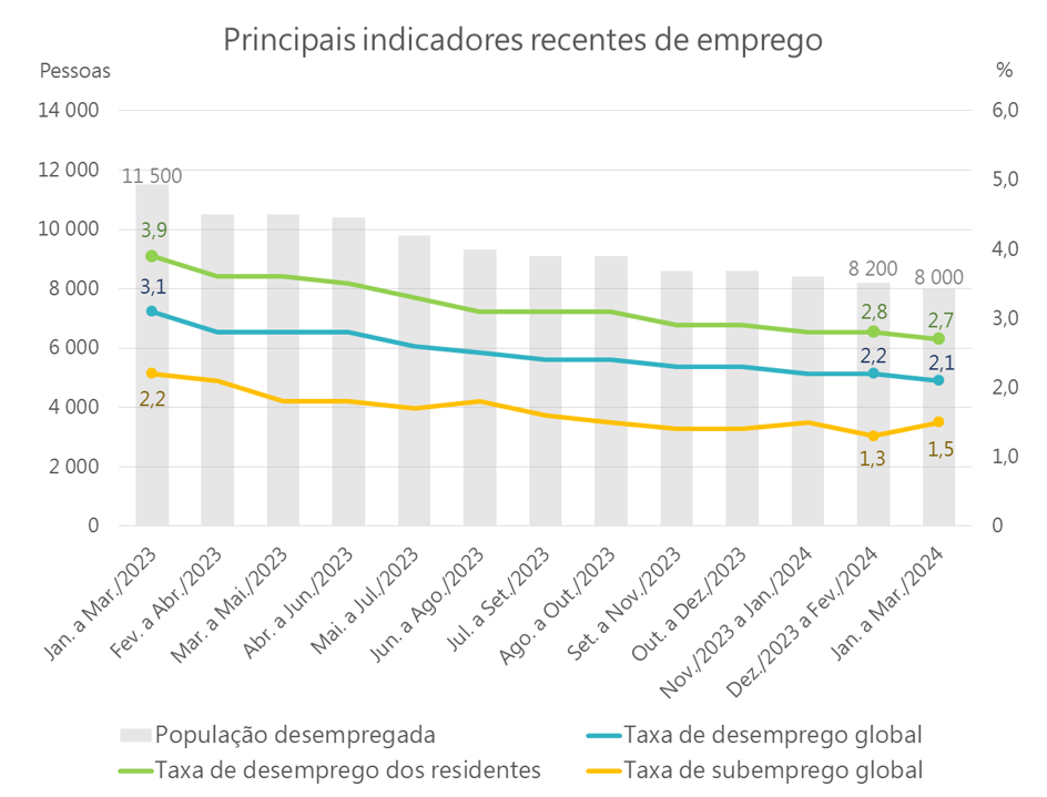 Analisando por três meses consecutivos, a taxa de desemprego global (2,1%) e a taxa de desemprego dos residentes (2,7%) no período de Janeiro a Março de 2024 decresceram ambas 0,1 pontos percentuais, face ao período passado (Dezembro de 2023 a Fevereiro de 2024). A taxa de subemprego (1,5%) aumentou 0,2 pontos percentuais. O número de empregados (371.100) subiu 300 pessoas, em comparação com o período precedente e o número de residentes empregados (284.000) diminuiu 300.
