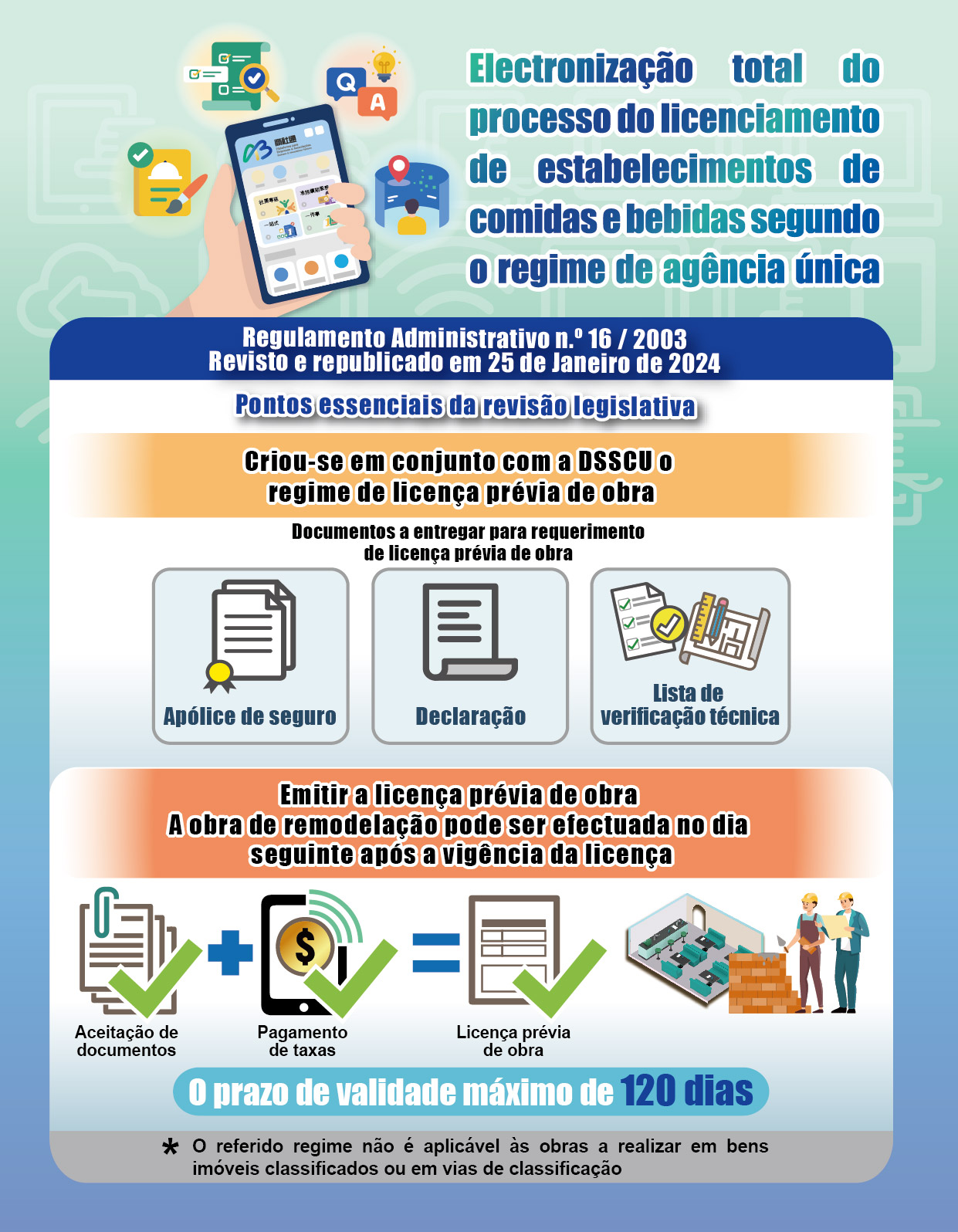 Com a introdução da licença prévia de obra, após a apresentação dos documentos necessários e o pagamento de taxas, o requerente recebe um recibo com validade de licença de obra, podendo iniciar de imediato as obras do estabelecimento no dia seguinte ao da emissão do recibo. A apreciação das plantas pode ser realizada simultaneamente com a execução das obras. Sob o novo regime, a vistoria e a inspecção contra incêndio são abrangidas no procedimento do licenciamento. A marcação das datas para vistoria e inspecção é mais aberta e transparente., ficando assim resolvidos os problemas, que o sector levantou no passado, relacionados com a “dificuldade no início da obra, na apreciação e no início da actividade”.
