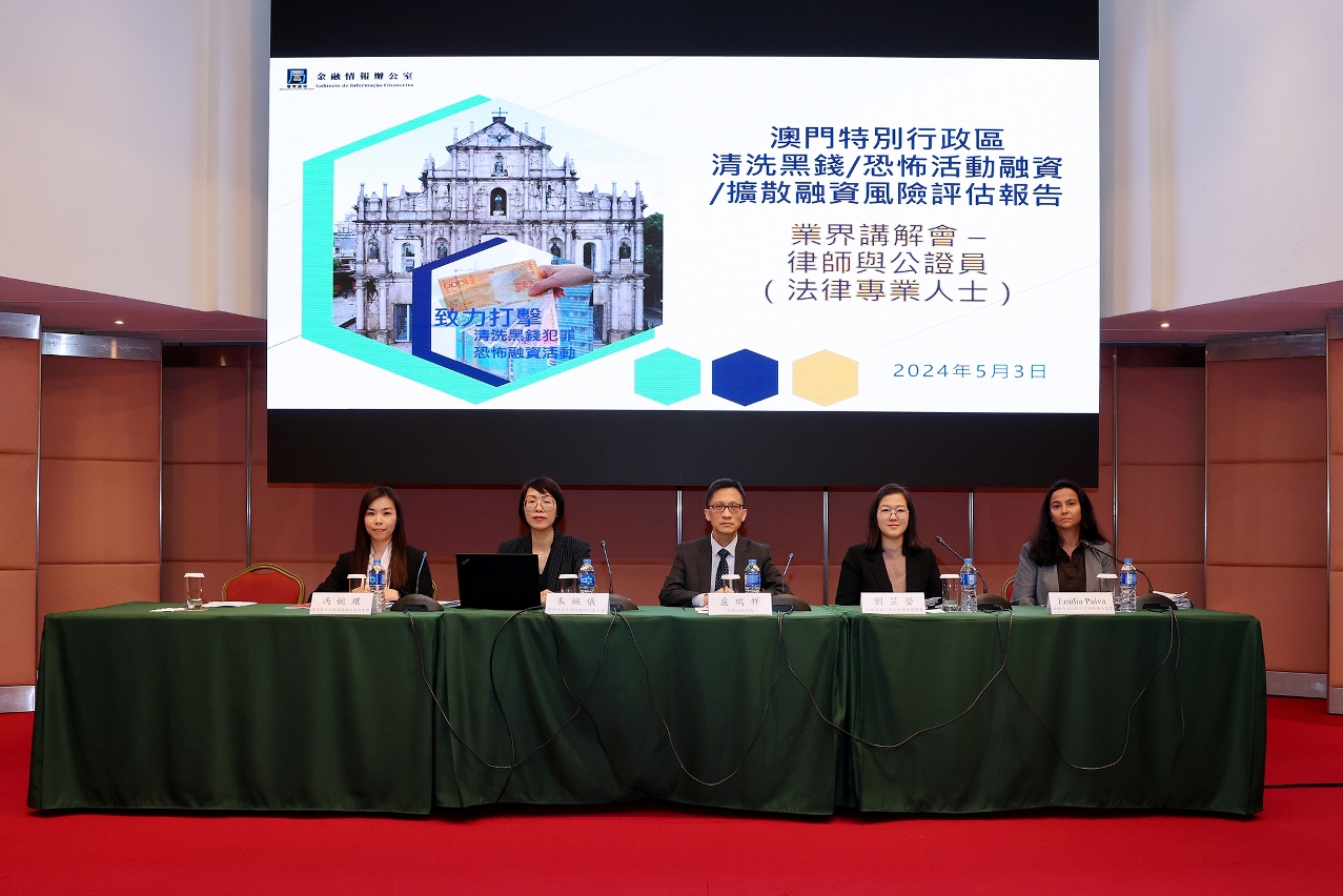 Realizou-se hoje, dia 3, uma sessão de esclarecimento sobre o Relatório de Avaliação de Riscos de Branqueamento de Capitais, de Financiamento do Terrorismo e de Financiamento da Proliferação de Armas de Destruição Maciça da RAEM, co-organizada pelo Gabinete de Informação Financeira (GIF) dos Serviços de Polícia Unitários (SPU), pela Direcção dos Serviços de Assuntos de Justiça (DSAJ) e pela Associação dos advogados de Macau (AAM), para que o sector do notariado e da advocacia conheça a situação actual sobre a avaliação global dos respectivos riscos em Macau. A sessão de esclarecimento contou com a presença de 240 notários, advogados, advogados estagiários e profissionais da respectiva área.
