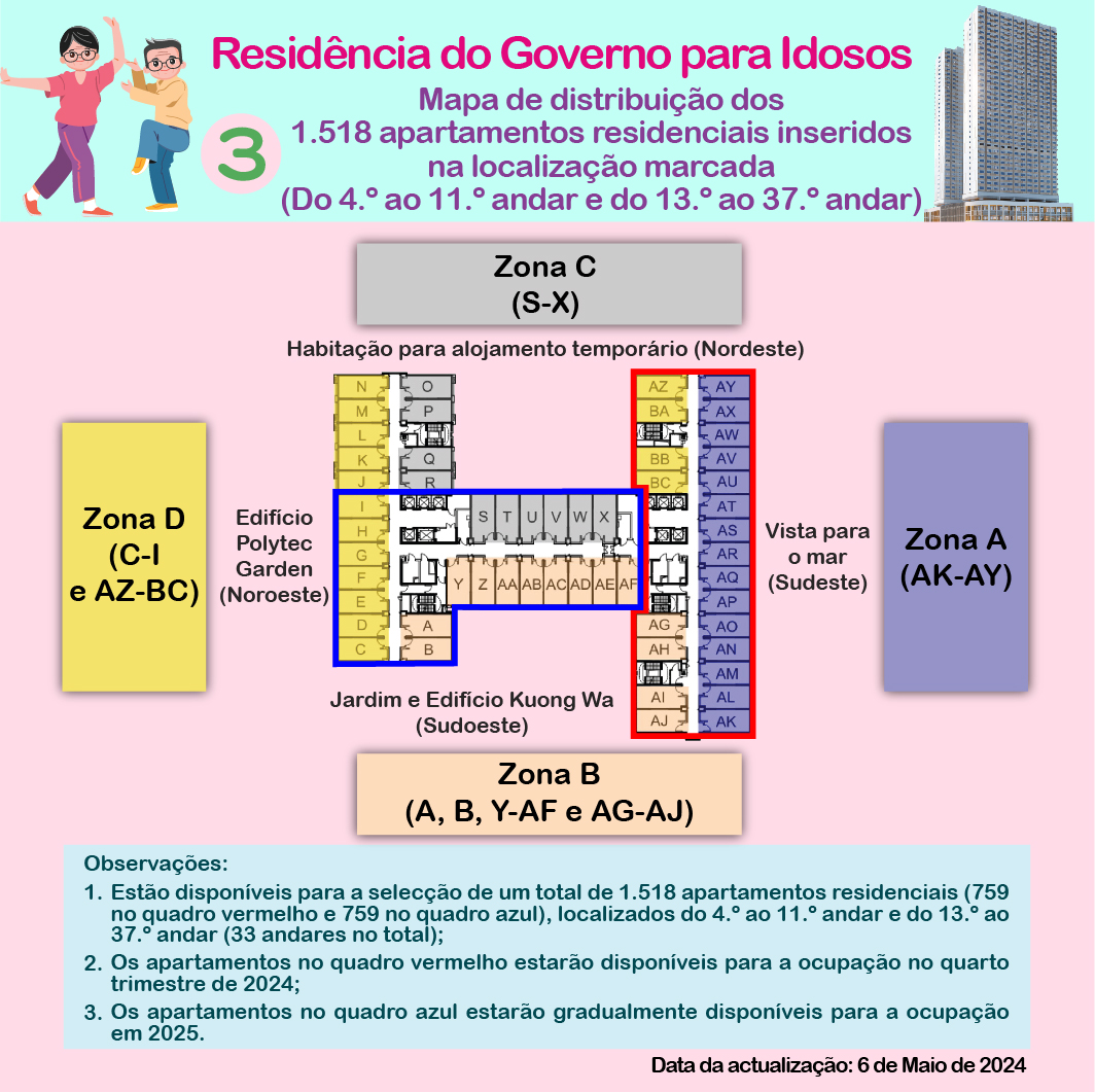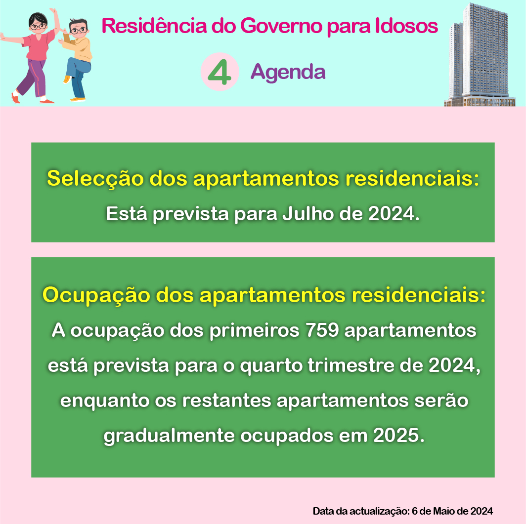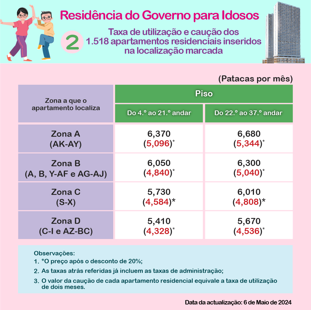 O Despacho da Secretária para os Assuntos Sociais e Cultura n.º 31/2024, publicado no Boletim Oficial da RAEM, que anuncia a tabela da taxa de utilização dos apartamentos residenciais da Residência do Governo para Idosos, os requisitos para beneficiar de desconto e os detalhes da distribuição dos 1.518 apartamentos residenciais.
