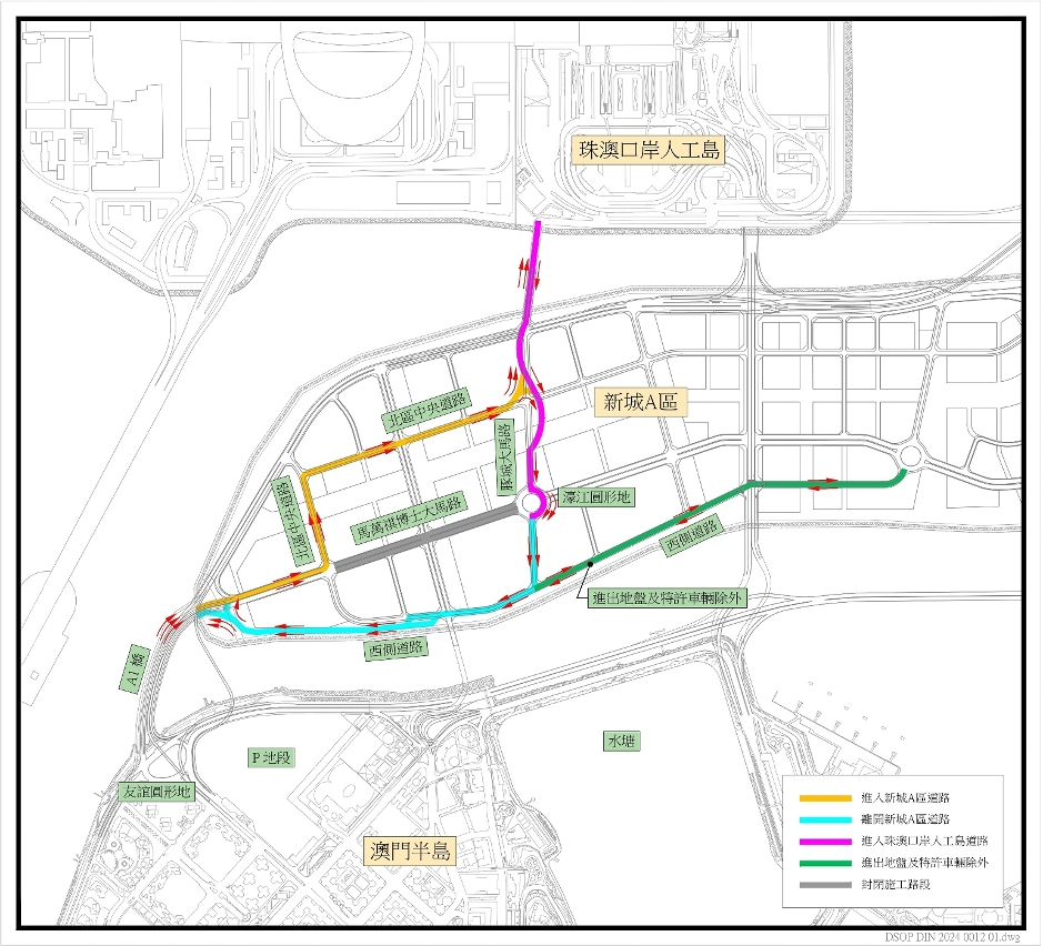 O arruamento central da Zona A dos Novos Aterros Urbanos vai entrar em funcionamento no dia 20 de Maio de 2024 (na próxima segunda-feira), a partir desse momento, os veículos que entram pela península de Macau no Posto Fronteiriço de Hong Kong – Zhuhai – Macau devem utilizar o novo arruamento central construído da zona norte, e uma parte do troço da Avenida Doutor Ma Man Kei vai ser encerrada provisoriamente a partir do dia 20 de Maio de 2024, no sentido de criar as condições para a execução das obras de galeria técnica e de arruamento (vide desenho). Apela-se aos condutores para prestarem atenção à sinalização de trânsito no local.