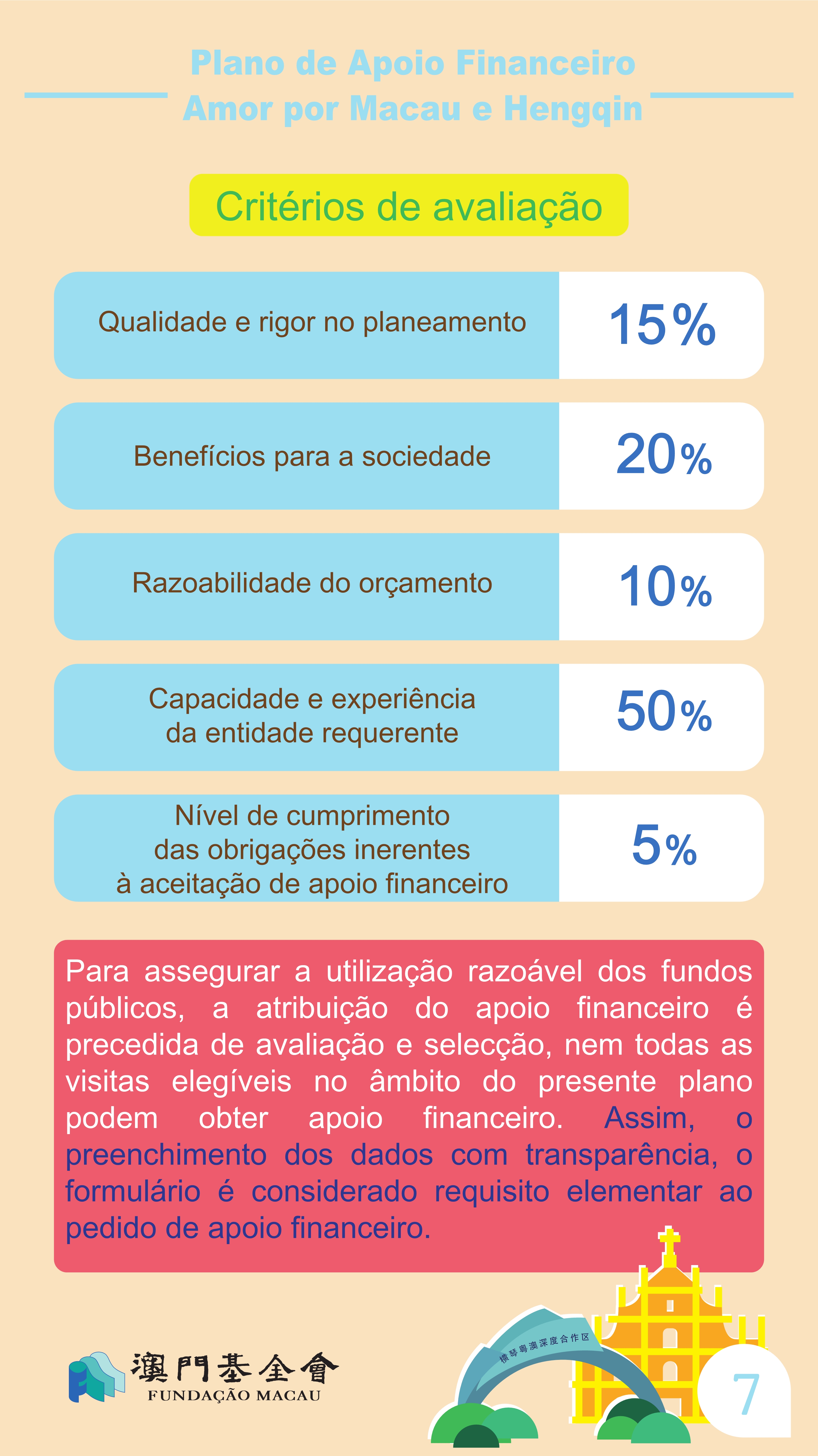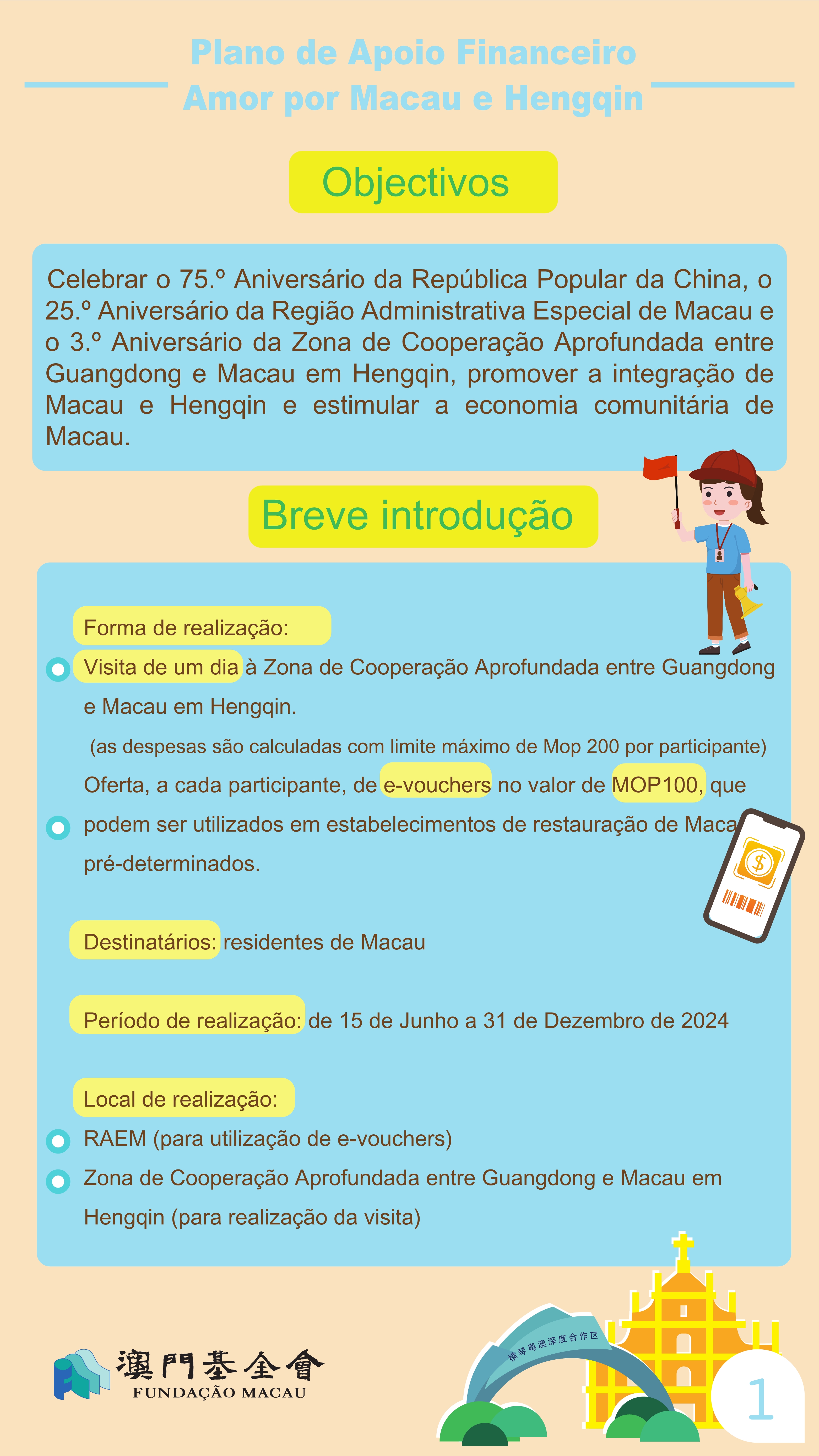 Com o objectivo de celebrar o 75º Aniversário da Implantação da República Popular da China, o 25º Aniversário do estabelecimento da Região Administrativa Especial de Macau e o 3º Aniversário do Estabelecimento da Zona de Cooperação Aprofundada entre Guangdong e Macau em Hengqin, de promover a integração de Macau e Hengqin, para estimular a economia comunitária de Macau, a Fundação Macau (doravante designado por FM) decidiu instituir o “Plano de Apoio Financeiro Amor por Macau e Hengqin” (doravante designado por Plano), para subsidiar associações que organizem visitas de um dia a Hengqin e oferecer vouchers electrónicos a serem consumidos em Macau.O período de candidatura a este plano vai de 20 a 31 de Maio de 2024.