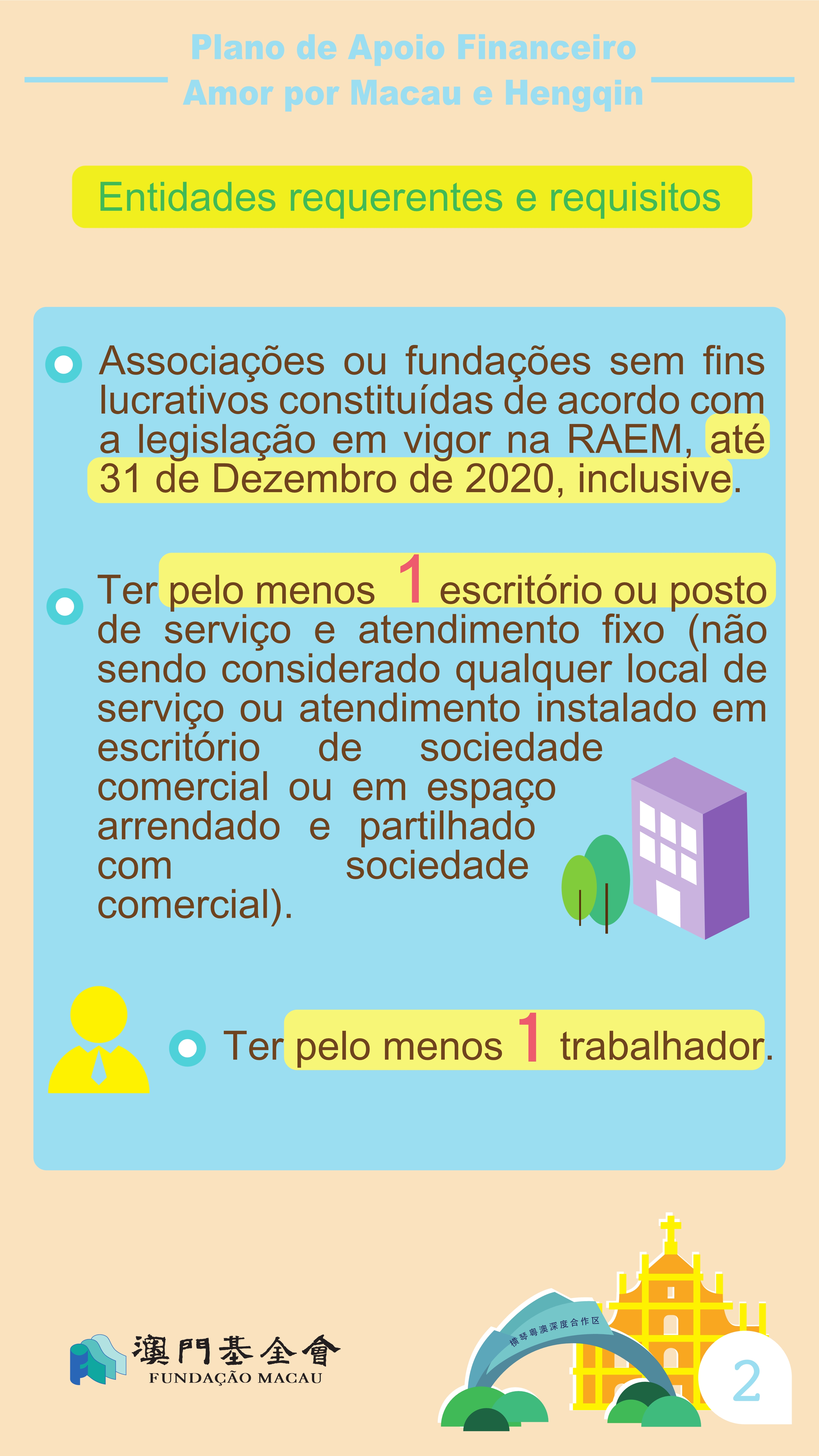 As associações que preencham os seguintes requisitos podem candidatar-se: constituídas em Macau, de acordo com a legislação em vigor antes de 31 de Dezembro de 2020 , com pelo menos 1 estabelecimento fixo para escritório ou serviços e com pelo menos 1 trabalhador e o pedido do apoio e a execução efectiva de 5 grupos de visita ou mais (40 pessoas por grupo, destinados para residentes de Macau).