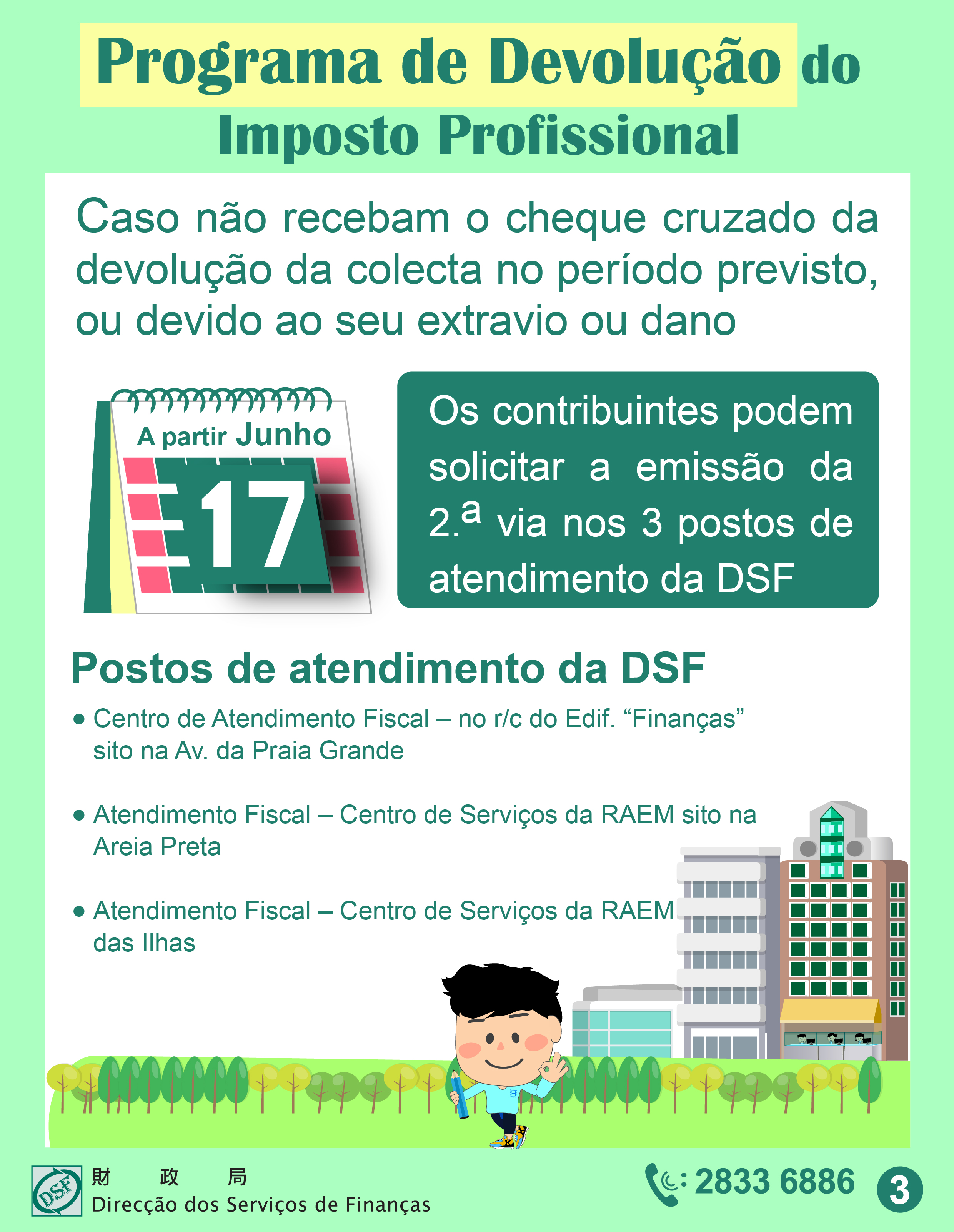 Em caso de dúvidas, pode ligar para a Linha Aberta para informações fiscais da DSF através do n.º 2833 6886.