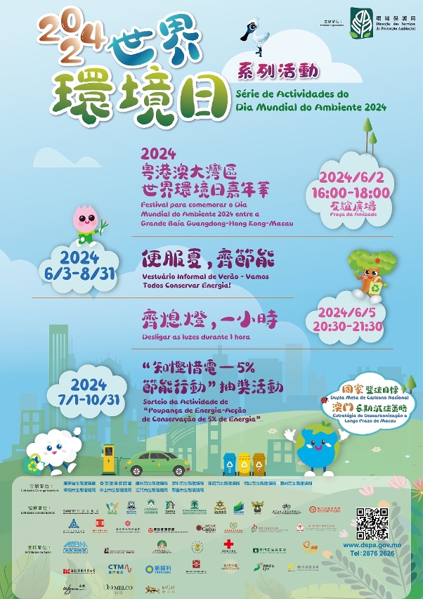 No dia 5 de Junho celebra-se o Dia Mundial do Ambiente. Com o objectivo de promover, junto de todos os sectores da sociedade, a concretização da “Dupla Meta de Carbono” Nacional, a Direcção dos Serviços de Protecção Ambiental (DSPA) volta a convidar os departamentos de protecção ambiental da Grande Baía Guangdong-Hong Kong-Macau, diversos serviços públicos, associações, complexos de entretenimento e hotéis, bem como outros organismos de Macau, para, nesta data em que anualmente se comemora a nível internacional a protecção ambiental, organizarem em conjunto a “Série de Actividades do Dia Mundial do Ambiente” 2024. As actividades incluem o “Festival para comemorar o Dia Mundial do Ambiente entre Guangdong-Hong Kong-Macau”, as iniciativas “Desligar as luzes durante 1 hora” e “Vestuário Informal de Verão - Vamos Todos Conservar Energia!”, e ainda, o Sorteio da Actividade de “Poupança de Energia – Acção de Conservação de 5% de Energia”. Espera-se conseguir, através desta série de actividades, aprofundar a cooperação e o intercâmbio no domínio da protecção ambiental, na Grande Baía Guangdong-Hong Kong-Macau, e incentivar os cidadãos a pôr em prática os conceitos de vida verde e de baixo carbono.