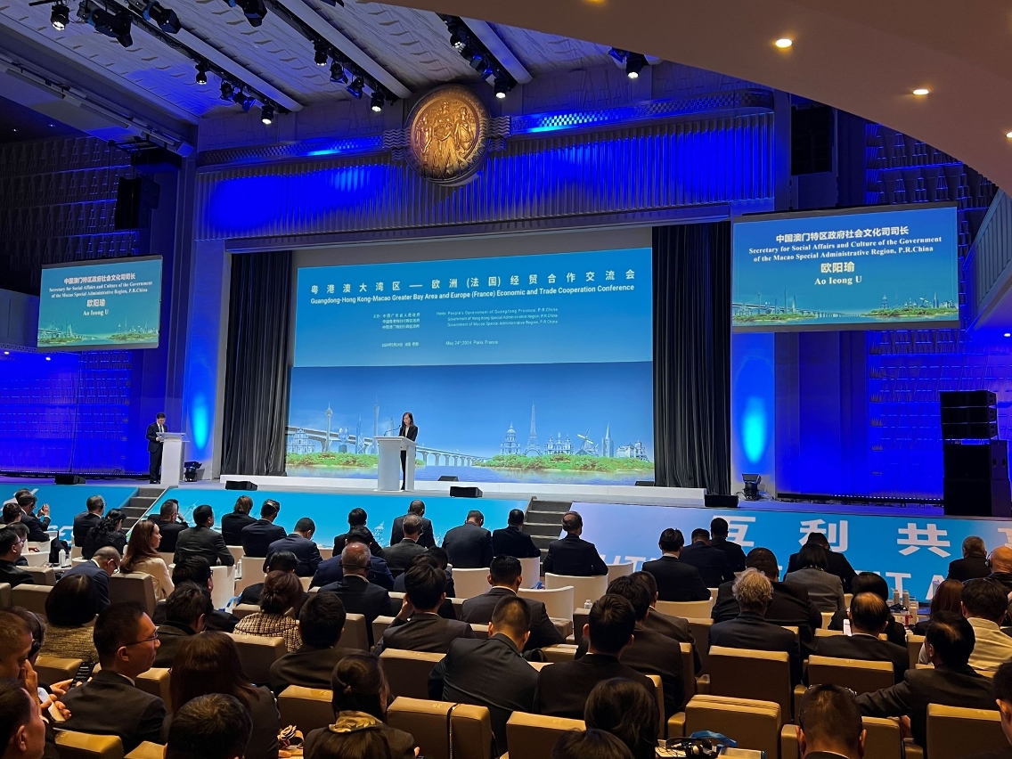 Coorganizada pelo Governo Popular da Província de Guangdong, pelo Governo da Região Administrativa Especial de Hong Kong (RAEHK) e pelo Governo da Região Administrativa Especial de Macau (RAEM), a “Conferência de Intercâmbio sobre a Cooperação Económica e Comercial entre a Grande Baía de Guangdong-Hong Kong-Macau e a Europa (França)” ocorreu, no dia 24 de Maio, hora do local, em Paris, França. A secretária para os Assuntos Sociais e Cultural, Ao Ieong U, em representação do Chefe do Executivo, esteve presente à conferência. Por esta ocasião, o Governo da RAEM pretende dar às outras regiões a conhecer, de forma mais completa, o desenvolvimento e as oportunidades de Macau, da Grande Baía e da Zona de Cooperação Aprofundada entre Guangdong e Macau em Hengqin, com o objectivo de impulsionar o intercâmbio e a cooperação entre Macau e outras regiões nos âmbitos económico, comercial e cultural.