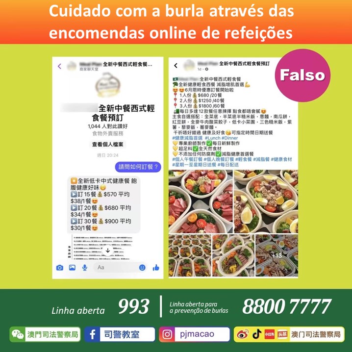 Nos últimos dias, a Polícia Judiciária recebeu denúncias de mais de dez cidadãos, relatando que encontraram uma página de uma plataforma de redes sociais que alegava prestar serviços de entrega de "refeições ligeiras". Esta página atraía vítimas com um preço preferencial para encomendas de grandes quantidades de refeições de uma só vez, ou para serviço de entrega de refeições por vários dias, fazendo-se o pagamento do valor total da encomenda através da transferência do banco online para uma conta indicada mas, todavia, apesar de pagas, as refeições encomendadas nunca foram entregues. Entretanto, foi perdido o contacto com a outra parte que devia prestar o serviço e as vítimas foram adicionadas à lista negra da referida página pelo que todas passaram a suspeitar que tinham sido enganadas. Neste caso, cada vítima reportou prejuízos entre centenas e milhares patacas, totalizando mais de 8.000 patacas.