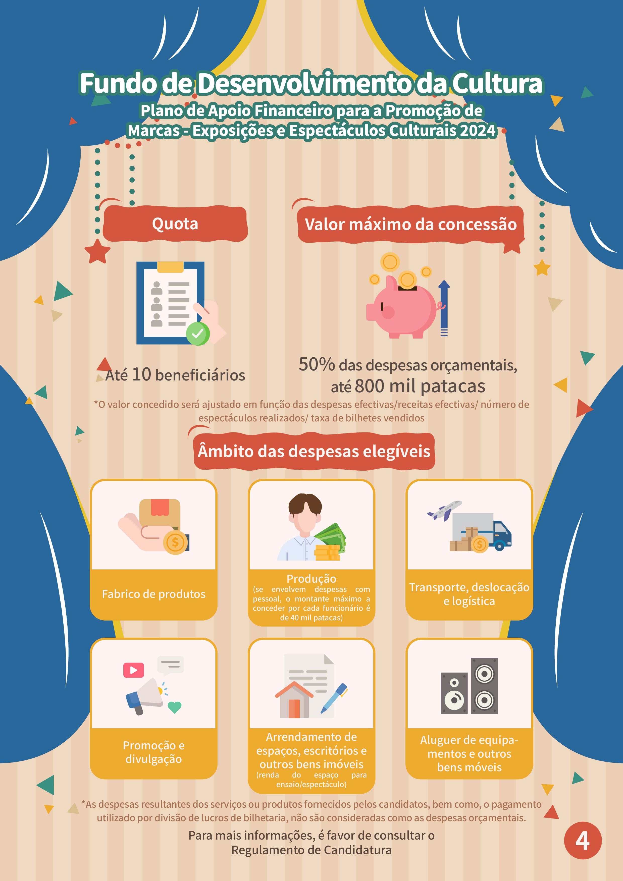 Serão aceites candidaturas ao“Plano de Apoio Financeiro para a Promoção de Marcas - Exposições e Espectáculos Culturais 2024” e “12.º Plano de subsídio à criação de amostras de design de moda”, no intuito de promover o desenvolvimento das indústrias de Macau, nomeadamente, artes do espectáculo e design de moda.