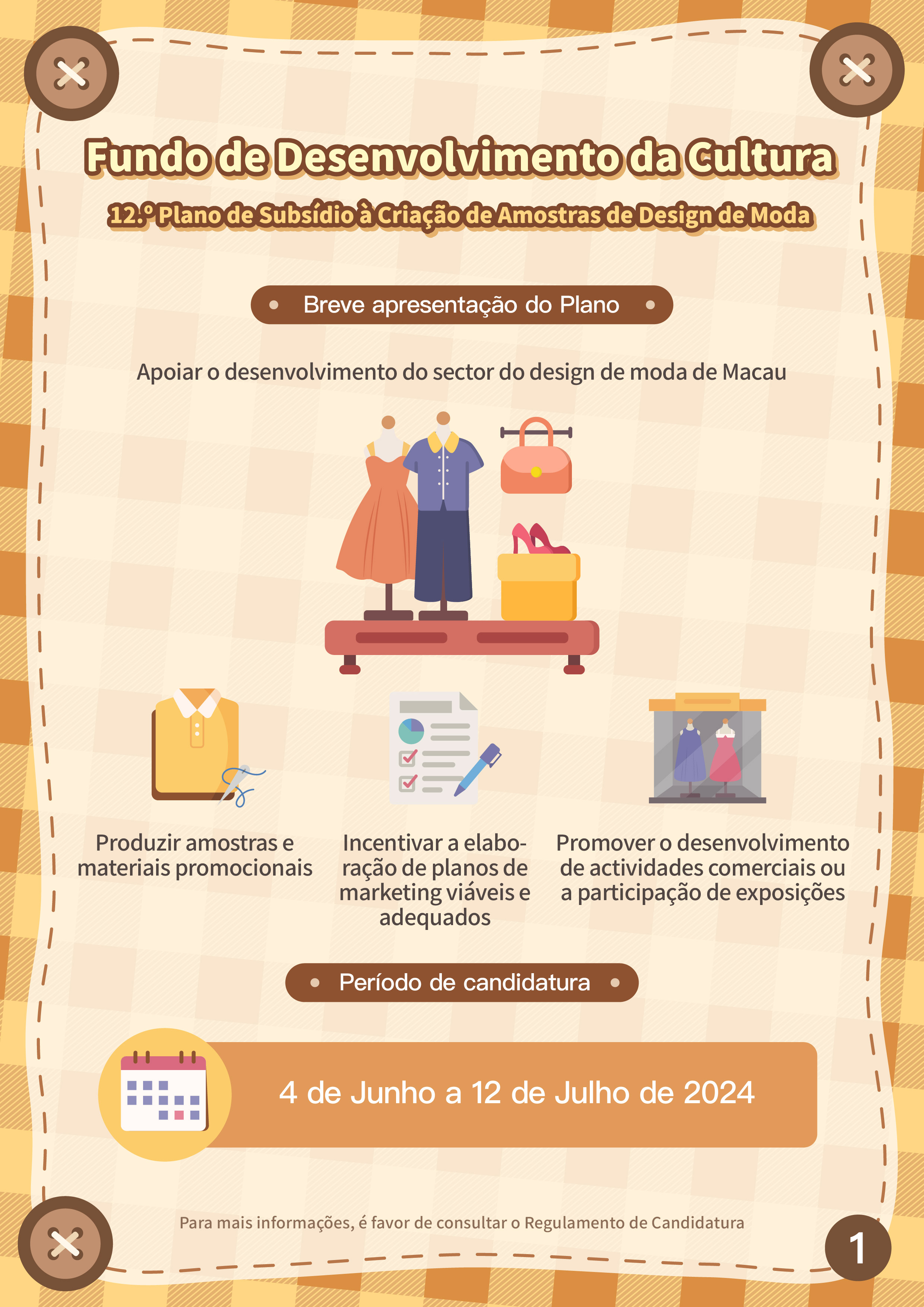 Ainda, serão aceites candidaturas ao “12.º Plano de subsídio à criação de amostras de design de moda”, de 4 de Junho a 12 de Julho, com vista a incentivar a investigação e desenvolvimento inovadores do design de moda local, impulsionar os designers a definir planos de marketing viáveis e promover o desenvolvimento de actividades comerciais ou a participação em exposições de moda de Macau e do exterior, aumentando assim a sua visibilidade e competitividade nos mercados. Os candidatos podem apresentar candidatura a título individual ou em grupo, cujo número mínimo de obras candidatas é de 8 modelos. Os projectos financiados devem participar, pelo menos, numa actividade de moda durante o prazo de apoio financeiro. O processo de avaliação é composto pela Primeira Análise (avaliação documental) e Segunda Análise (sessão de perguntas e respostas no local). Os candidatos que procederão à Segunda Análise devem escolher um modelo para apresentar uma amostra de moda no local, sendo a quota máxima de subsídio de 8 beneficiários.