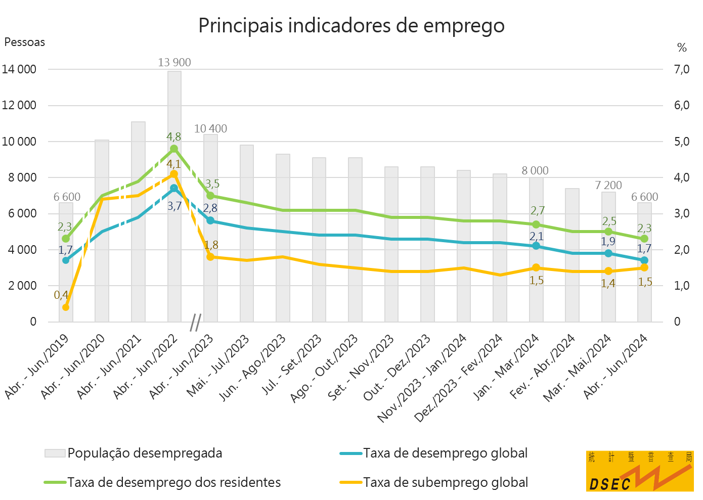 No segundo trimestre de 2024 tanto a taxa de desemprego global (1,7%) como a taxa de desemprego dos residentes (2,3%) desceram 0,4 pontos percentuais, em termos trimestrais e recuperaram para os níveis das taxas do segundo trimestre de 2019. A taxa de subemprego manteve-se em 1,5%, informam os Serviços de Estatística e Censos.